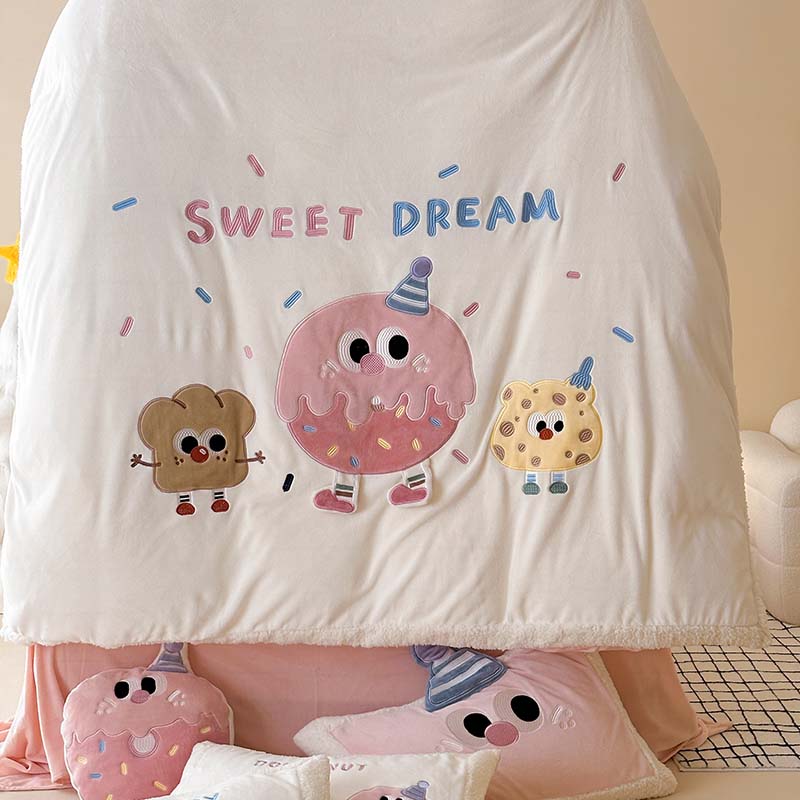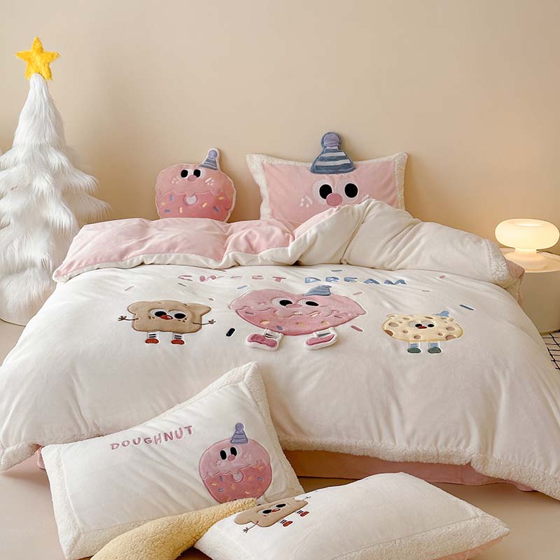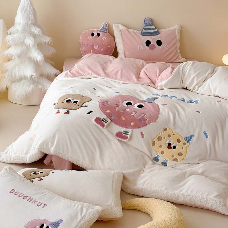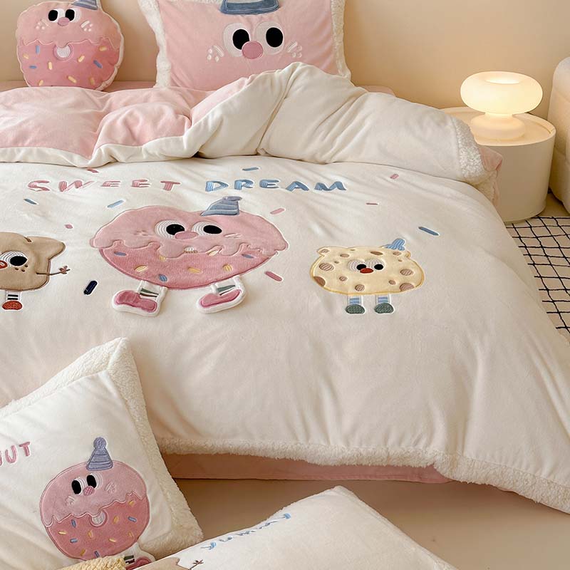 冬季卡通甜甜圈儿童少女心加厚牛奶绒四件套珊瑚绒被套三件套床品