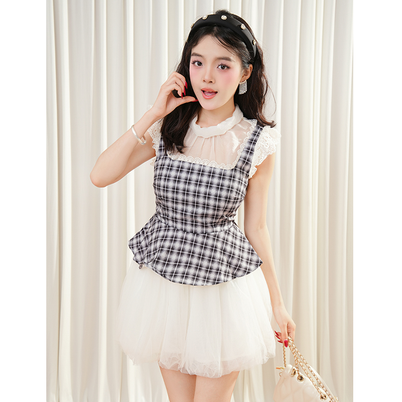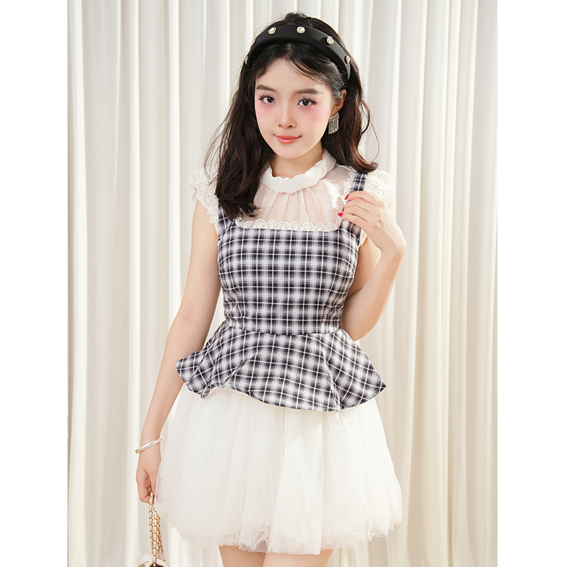 格雷系千金 夏季新款法式赫本风设计感格纹拼接收腰蓬蓬连衣裙女