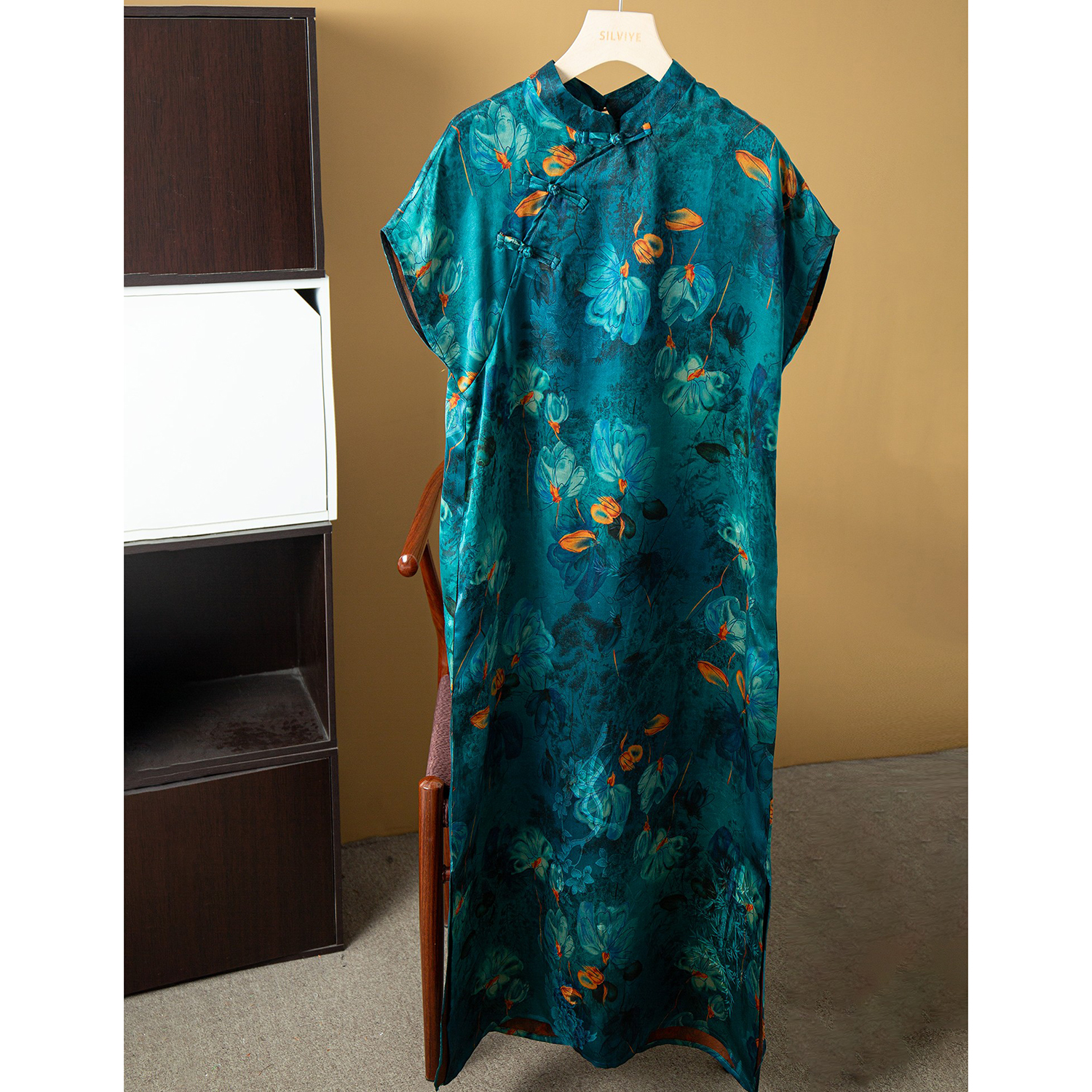 现货 国风刺绣真丝香云纱立领旗袍连衣裙女100%桑蚕丝收腰裙子夏