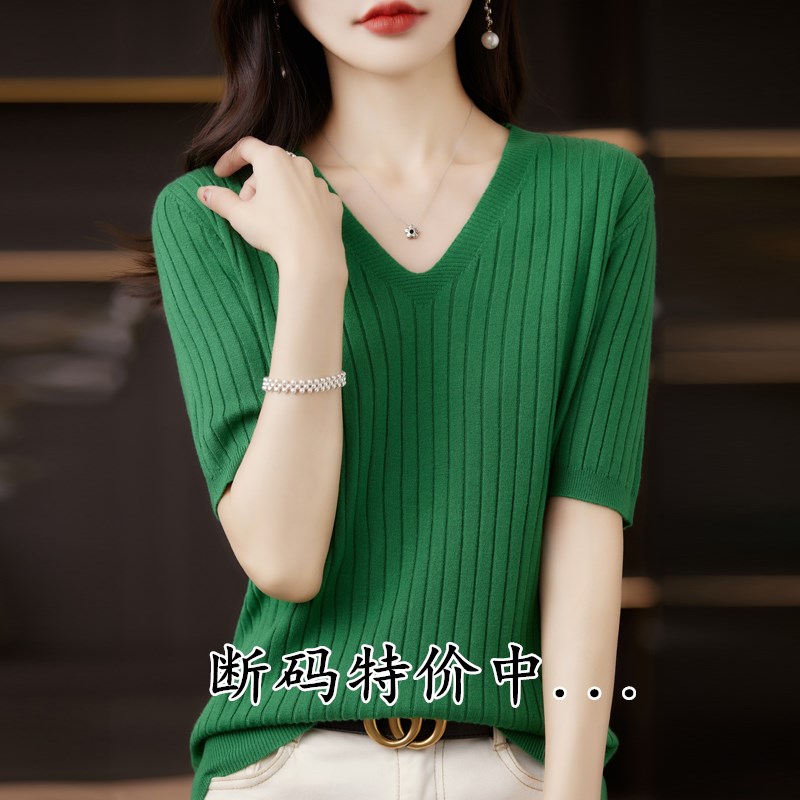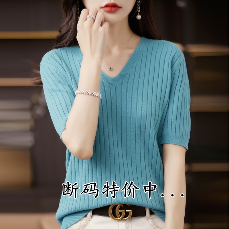 2025春夏新款V领洋气短袖女针织衫套头半袖毛衣女薄显瘦纯色内搭