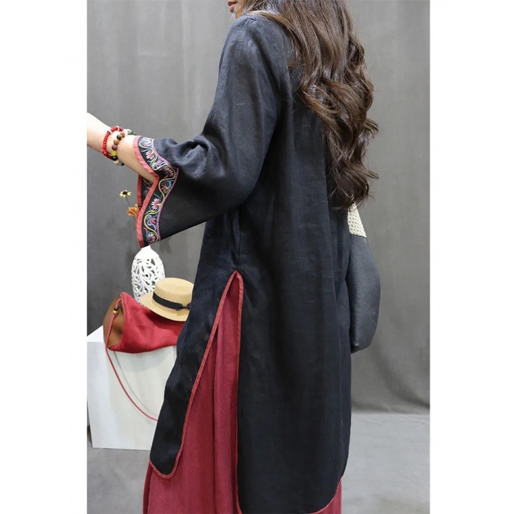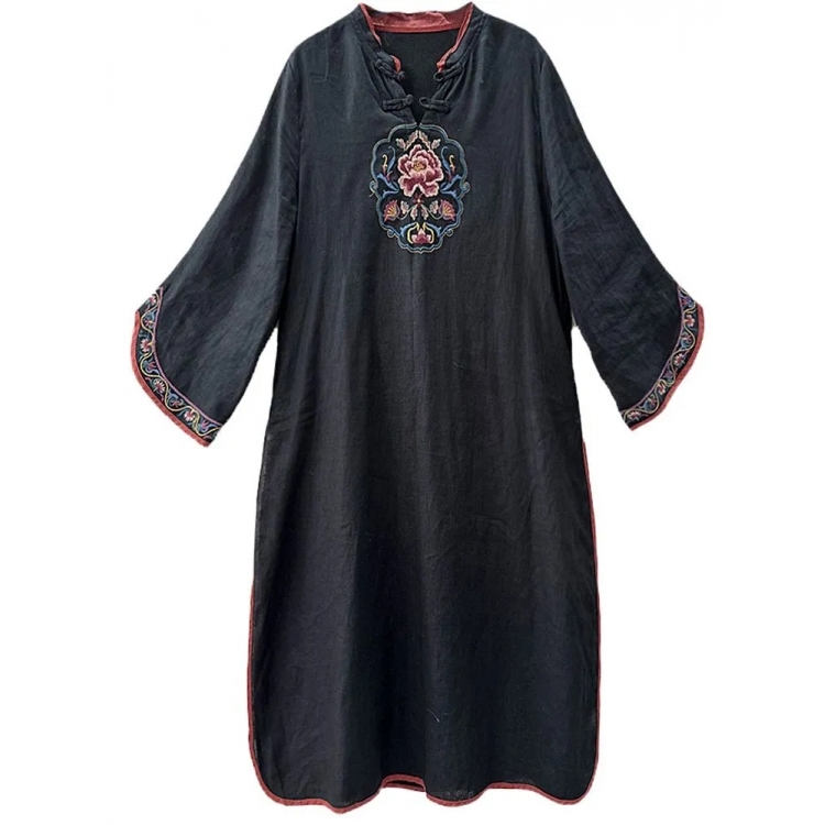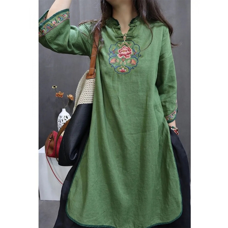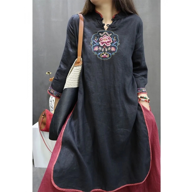 中式棉麻复古国风连衣裙重工刺绣民族中长款七分袖女夏季宽松裙子