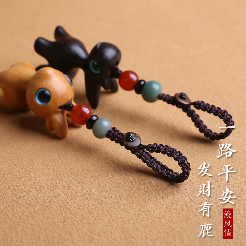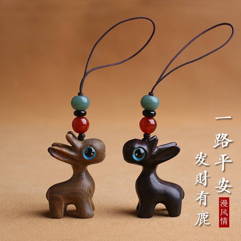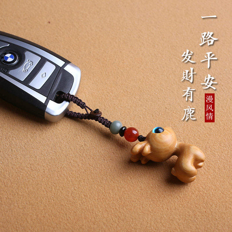 一路檀木小鹿汽车钥匙扣挂件手机吊坠男女情侣钥匙挂饰链