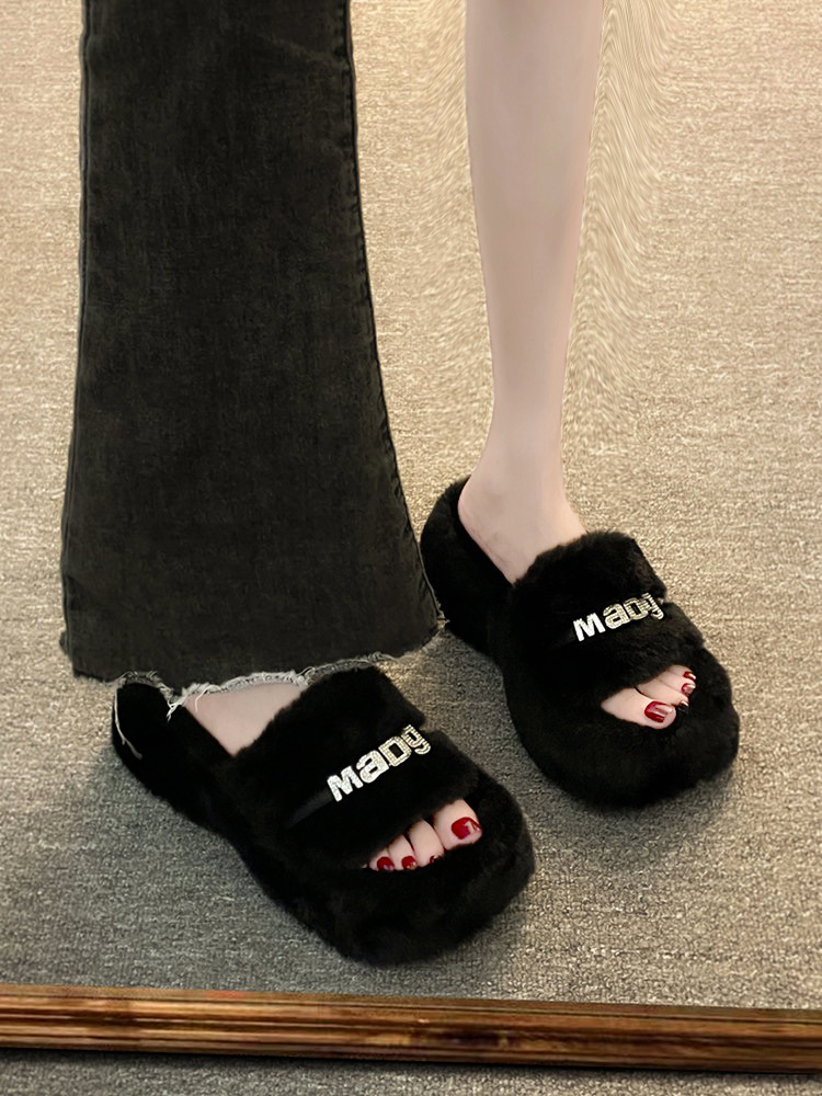 冬天厚底毛毛鞋女鞋子2023年新款小众设计感水钻一字增高棉拖鞋女