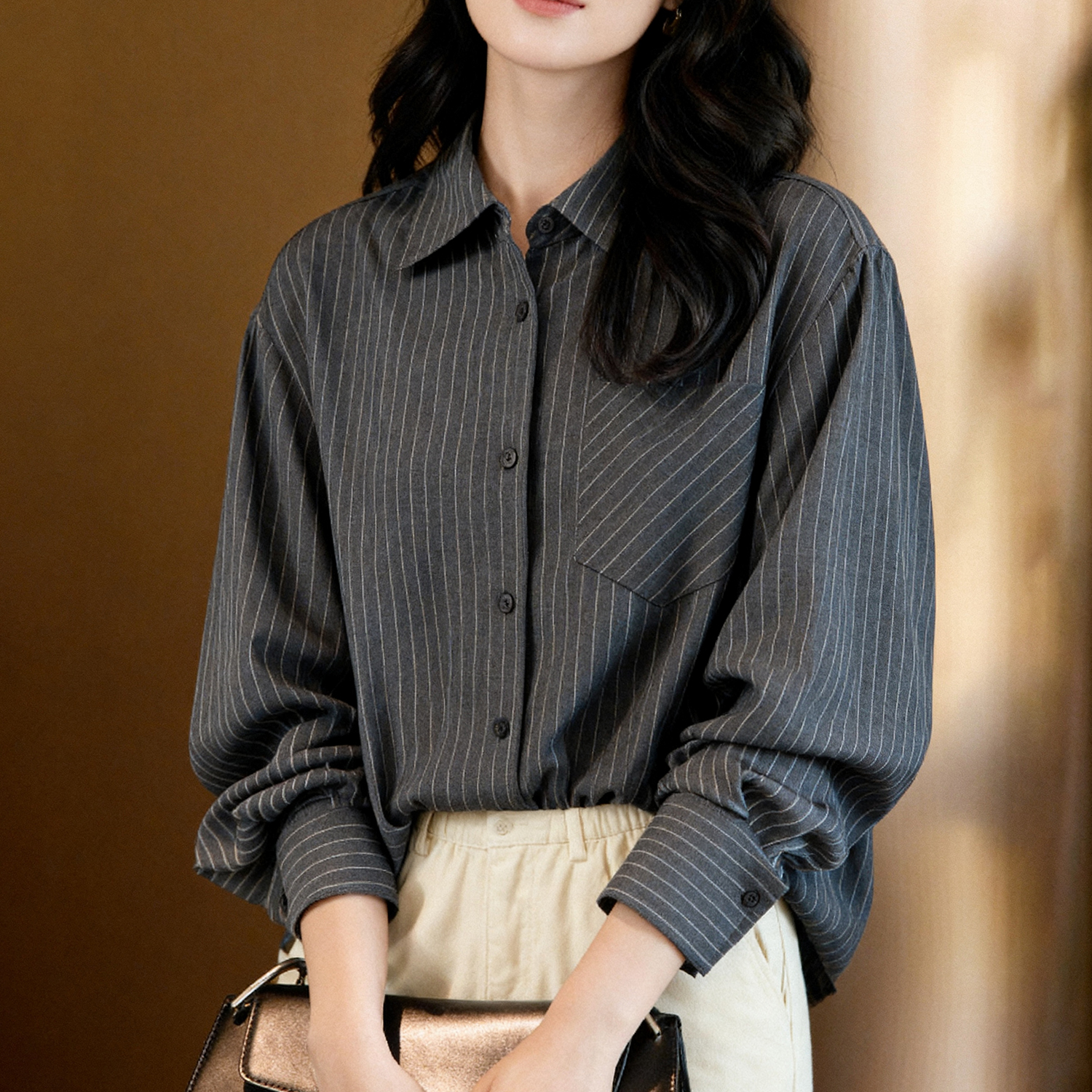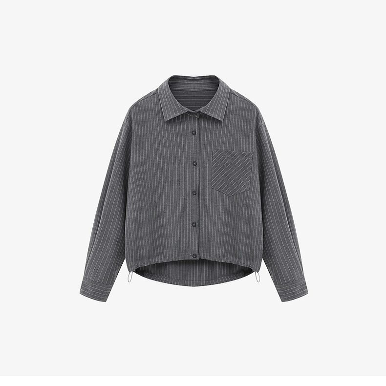 Basic House/百家好休闲撞色条纹衬衫百搭秋冬侧腰抽绳长袖上衣女