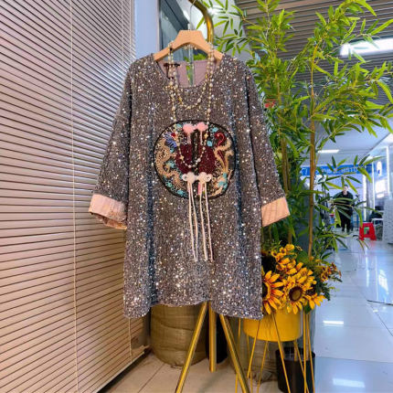 加肥亮片复古风短袖百搭洋气欧洲站上衣胖妹妹时尚显瘦百搭T恤衫