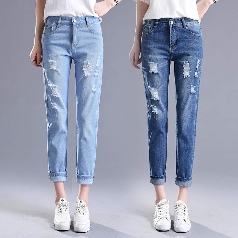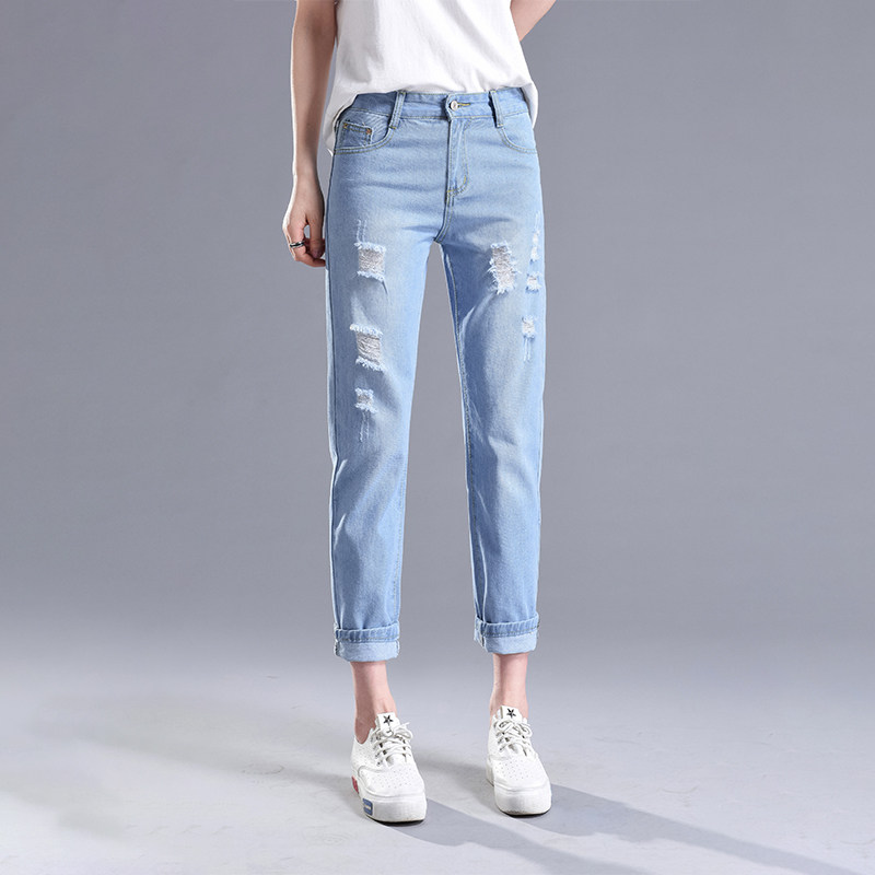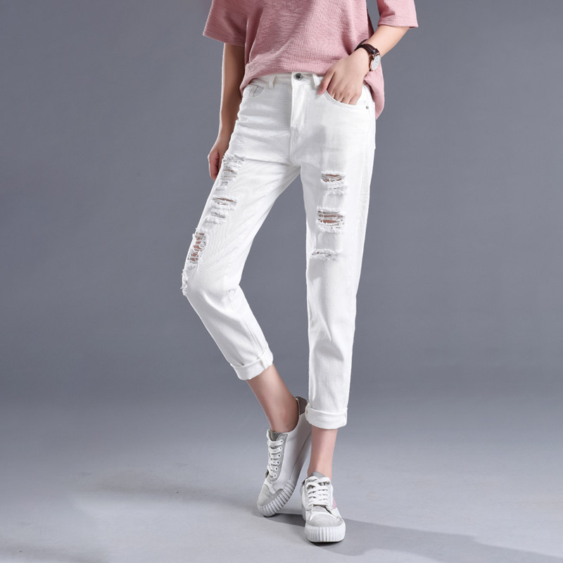 白色破洞直筒哈伦新款薄款九分裤