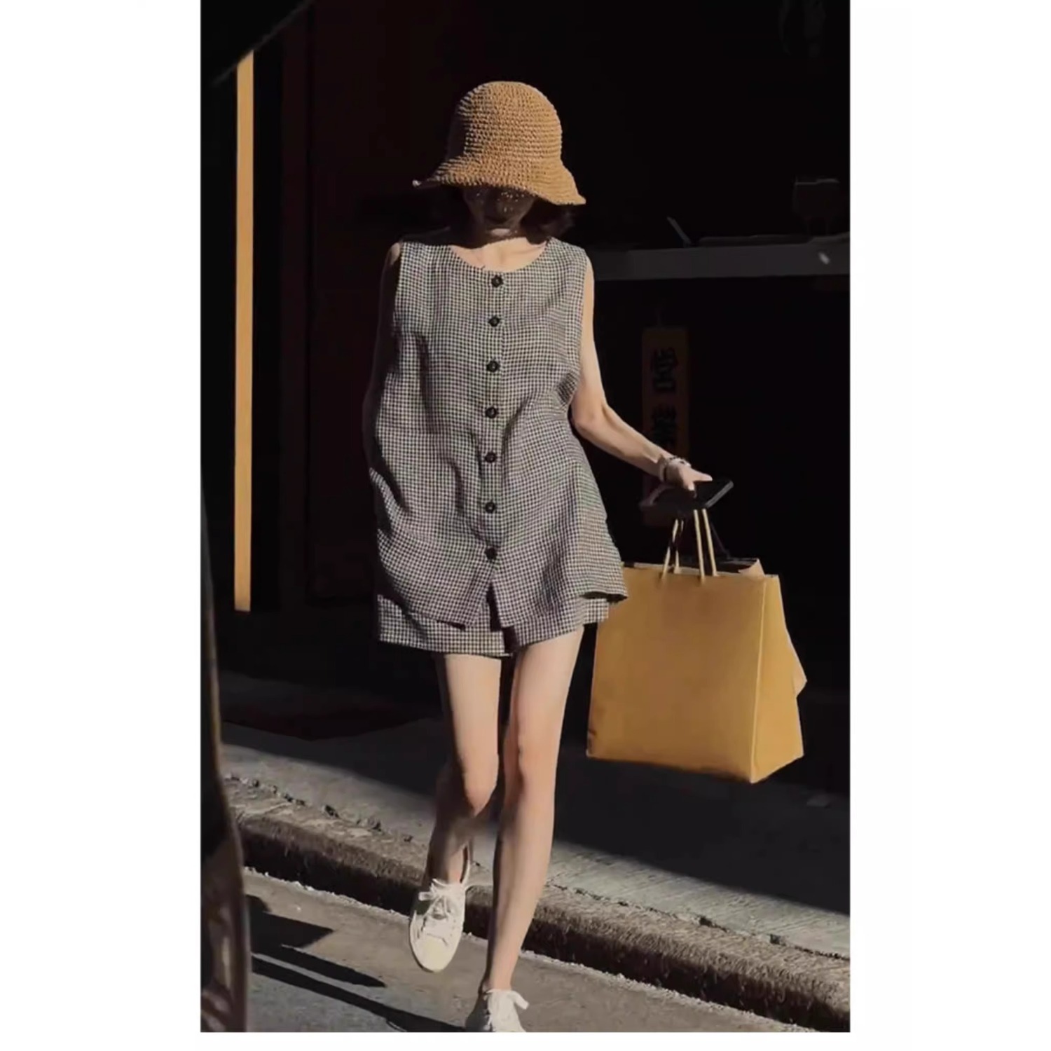 2025夏季宽松文艺时尚两件套格子棉麻无袖背心上衣休闲短裤套装女
