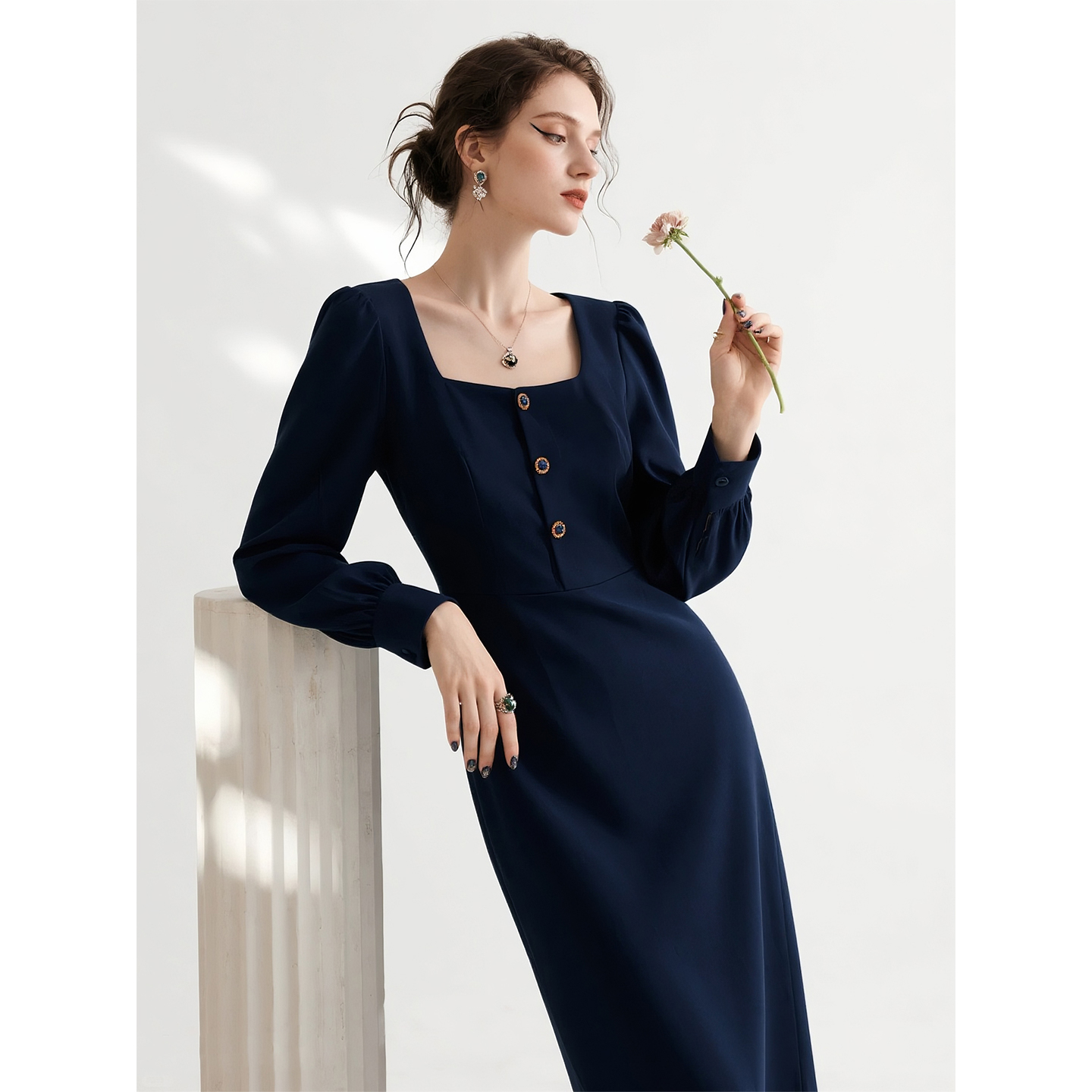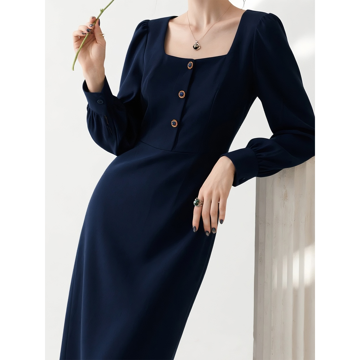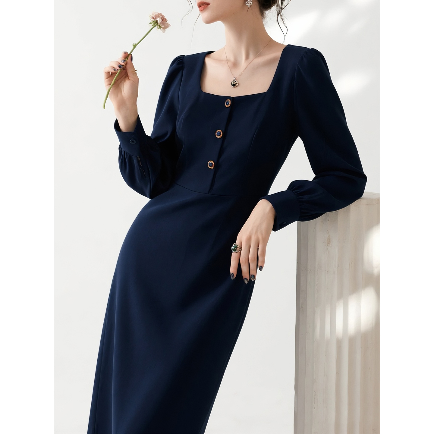 藏蓝色方领长袖连衣裙女2025年秋季新款法式复古气质显瘦优雅长裙