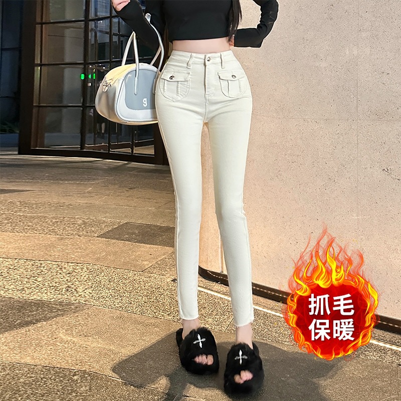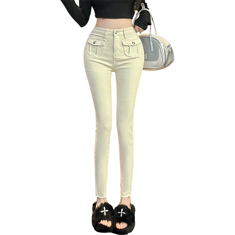米白色高腰小脚牛仔裤女2025秋季弹力修身显瘦辣妹九分铅笔裤子