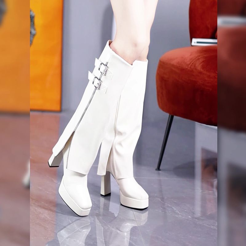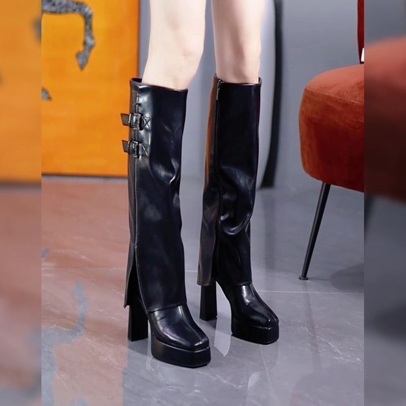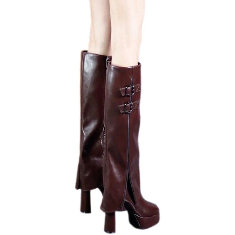 秋冬百搭防水台高跟不过膝裤管靴2025皮带扣粗跟高筒棕色骑士长靴