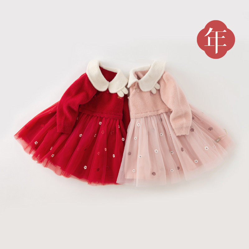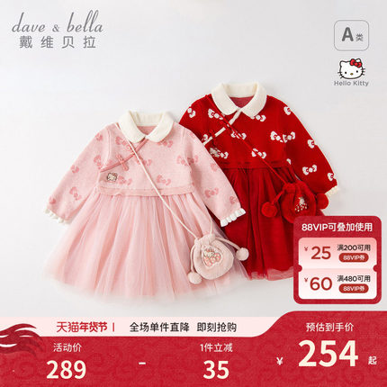 Hello Kitty联名戴维贝拉女童毛衣连衣裙冬女宝国风新年红色裙子