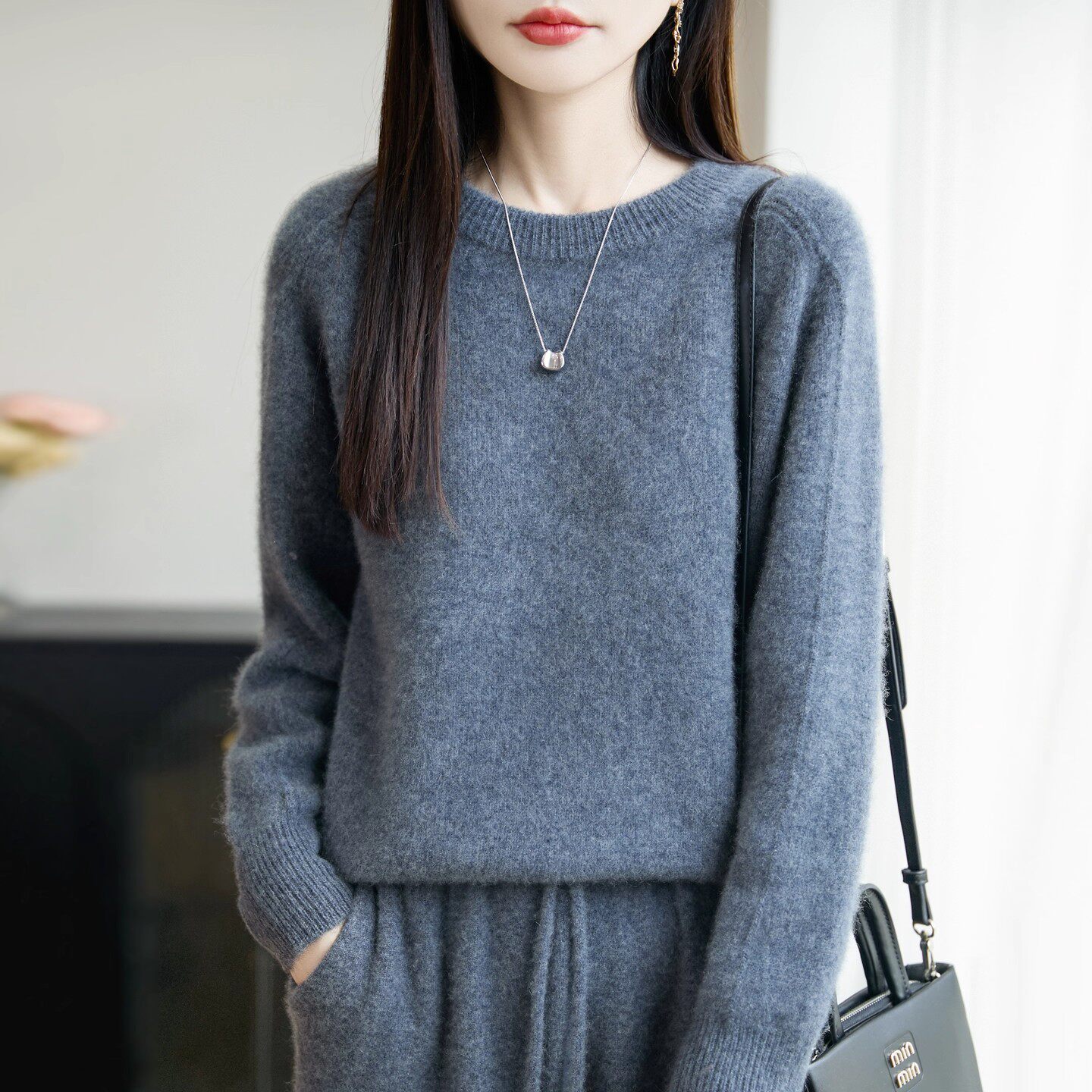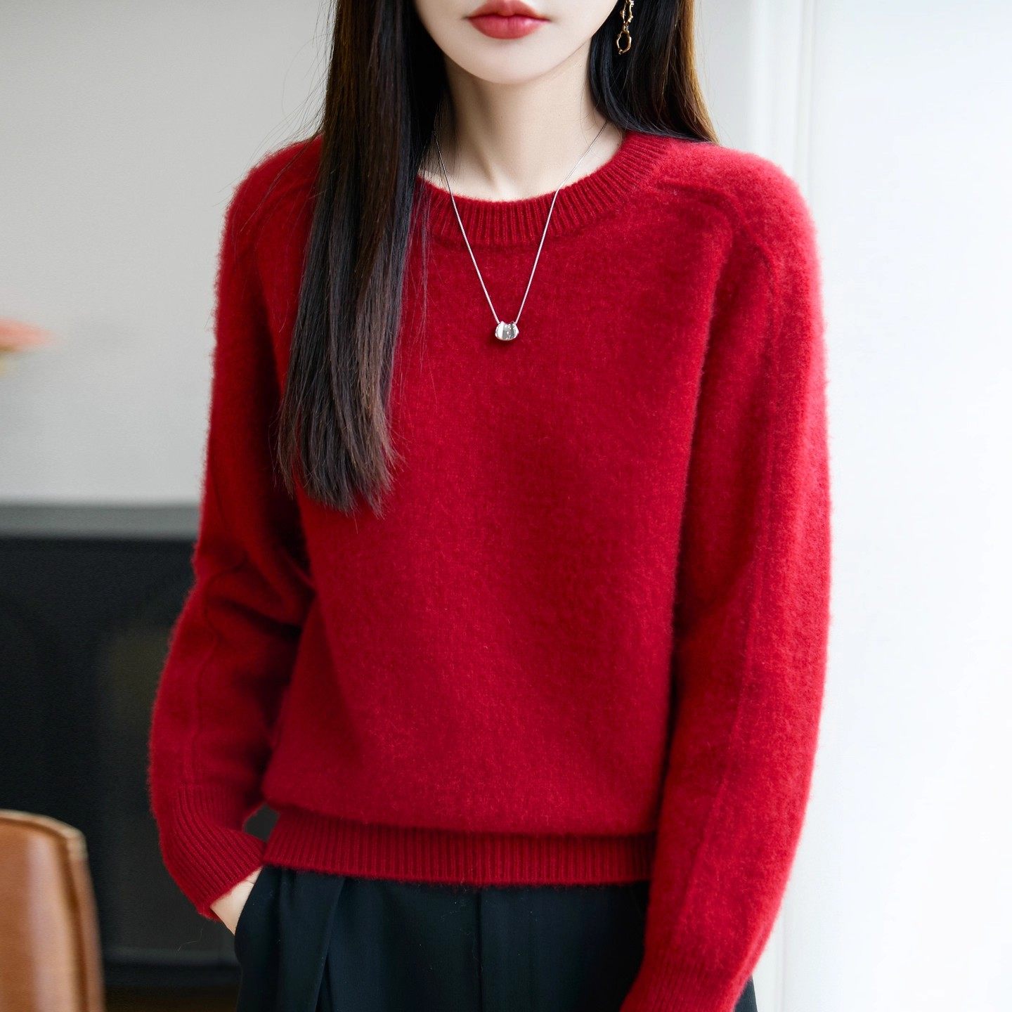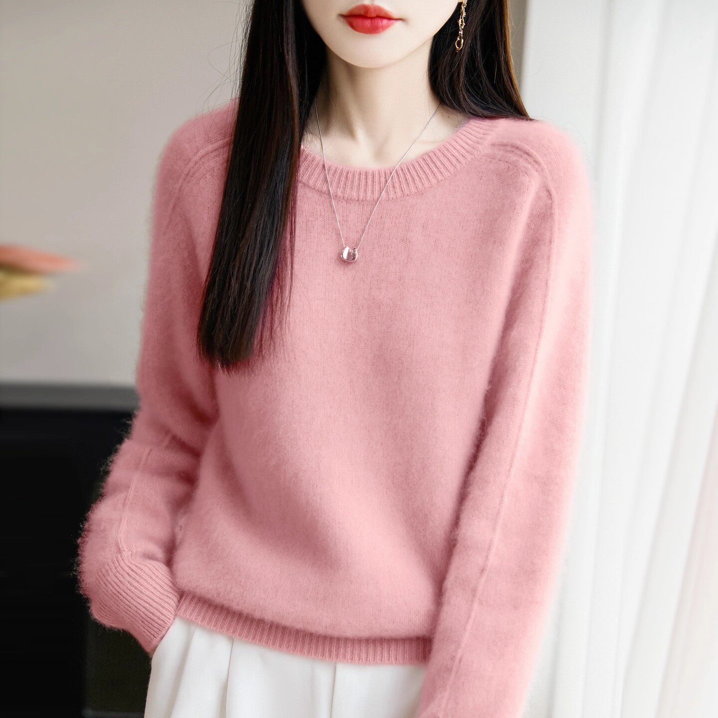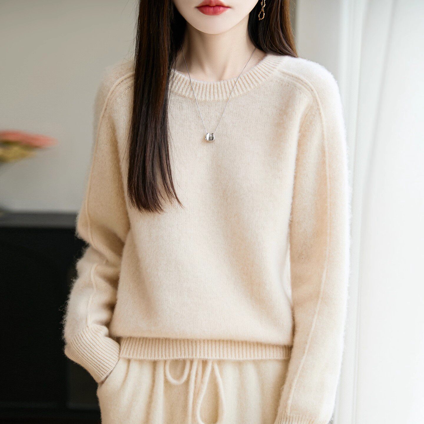 鄂尔多斯市简约风圆领羊绒衫女针织套头纯色宽松慵懒加厚百搭毛衣