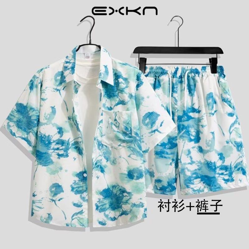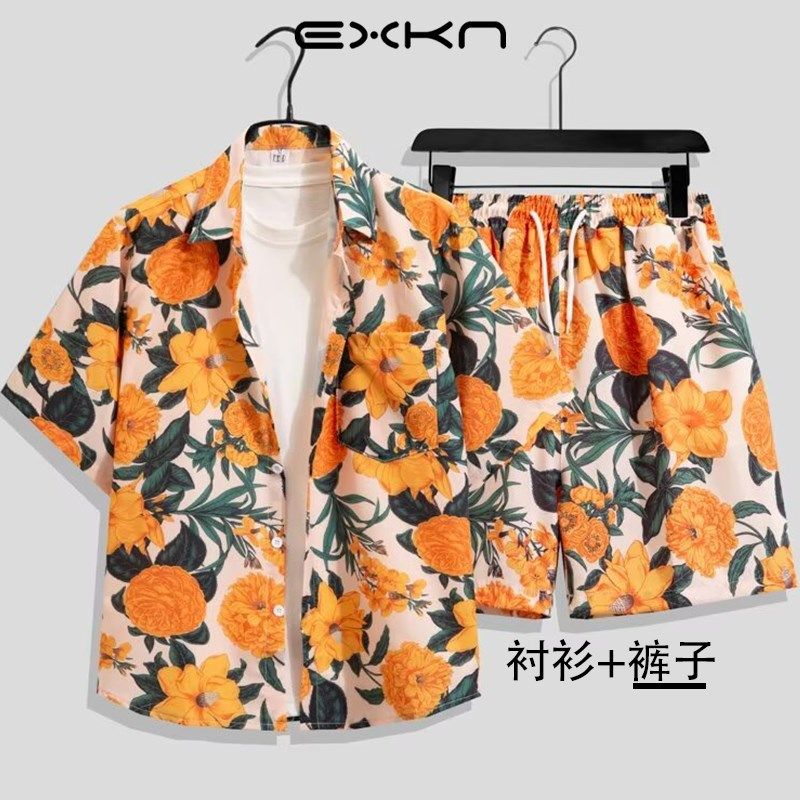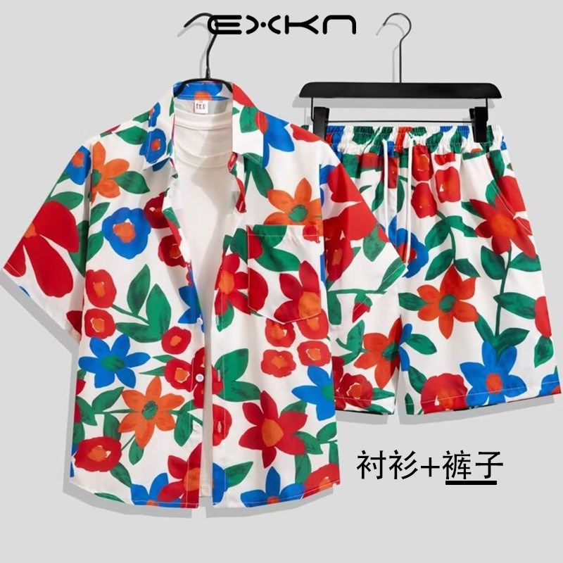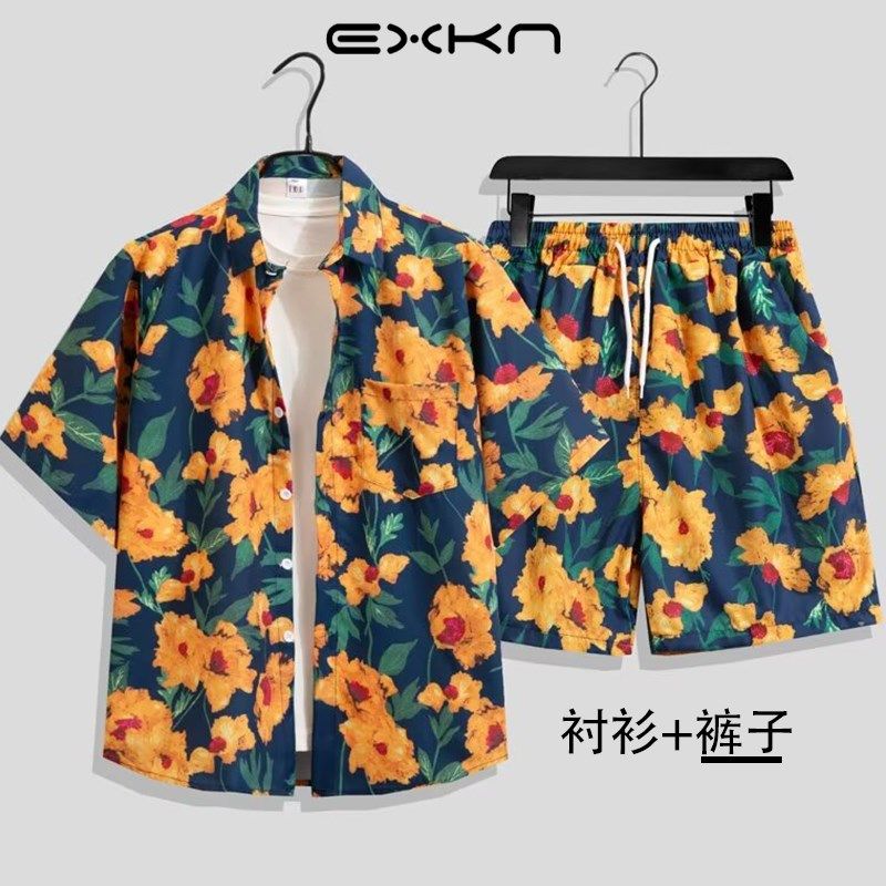 夏威夷风衬衫套装男夏季度假情侣休闲短袖五分短裤海边沙滩花衬衣