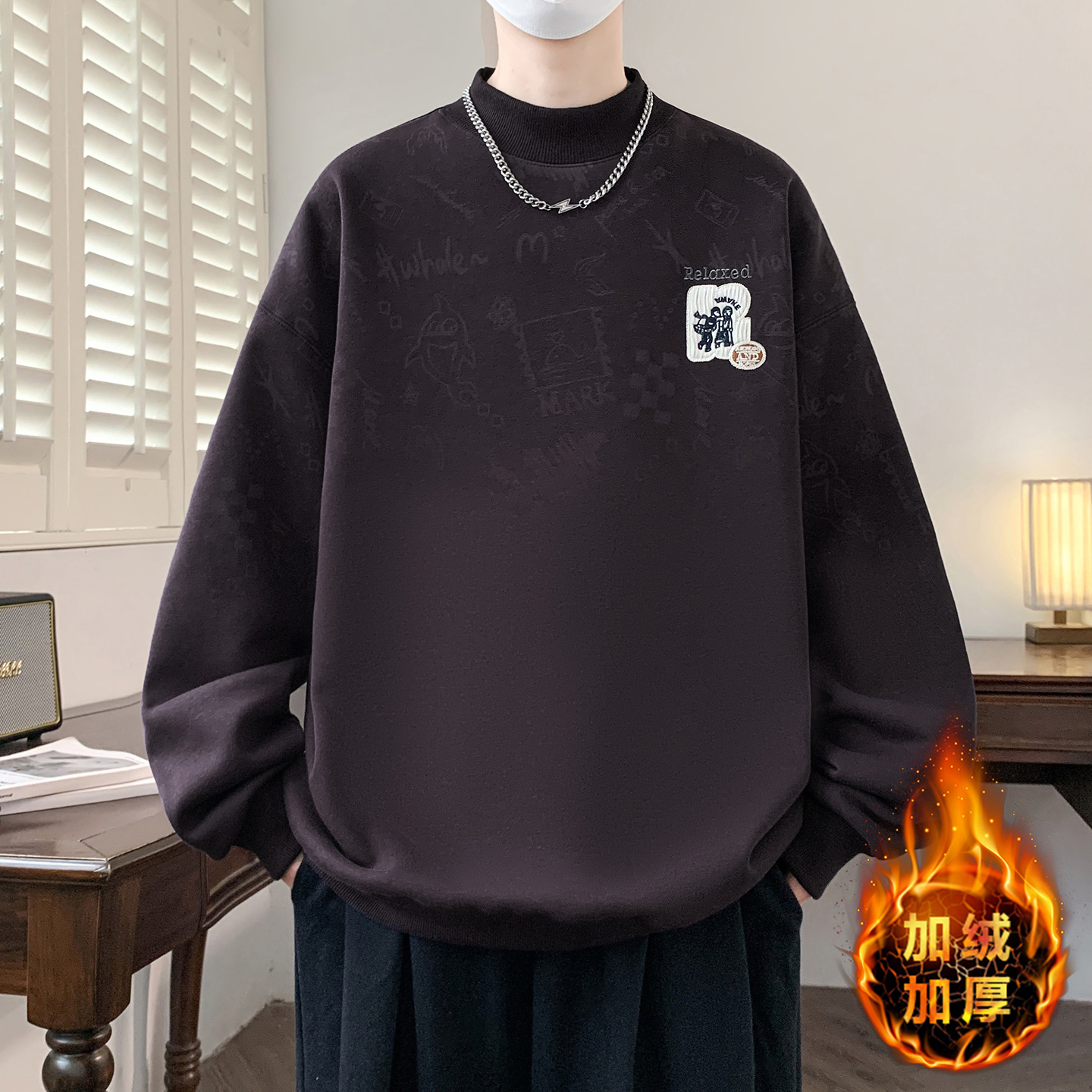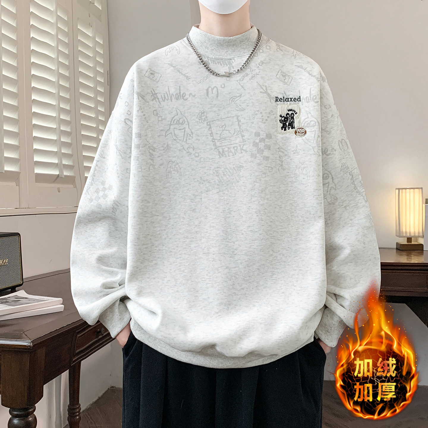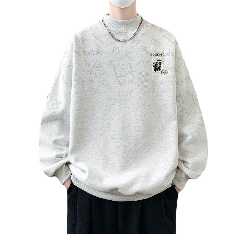 秋冬季加绒加厚卫衣男孩初中学生半高领上衣青少年大童潮流打底衫