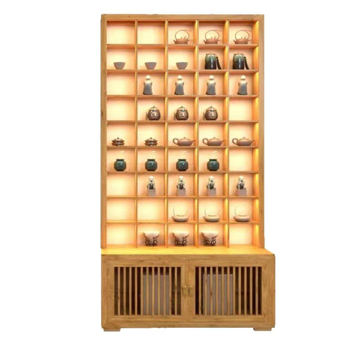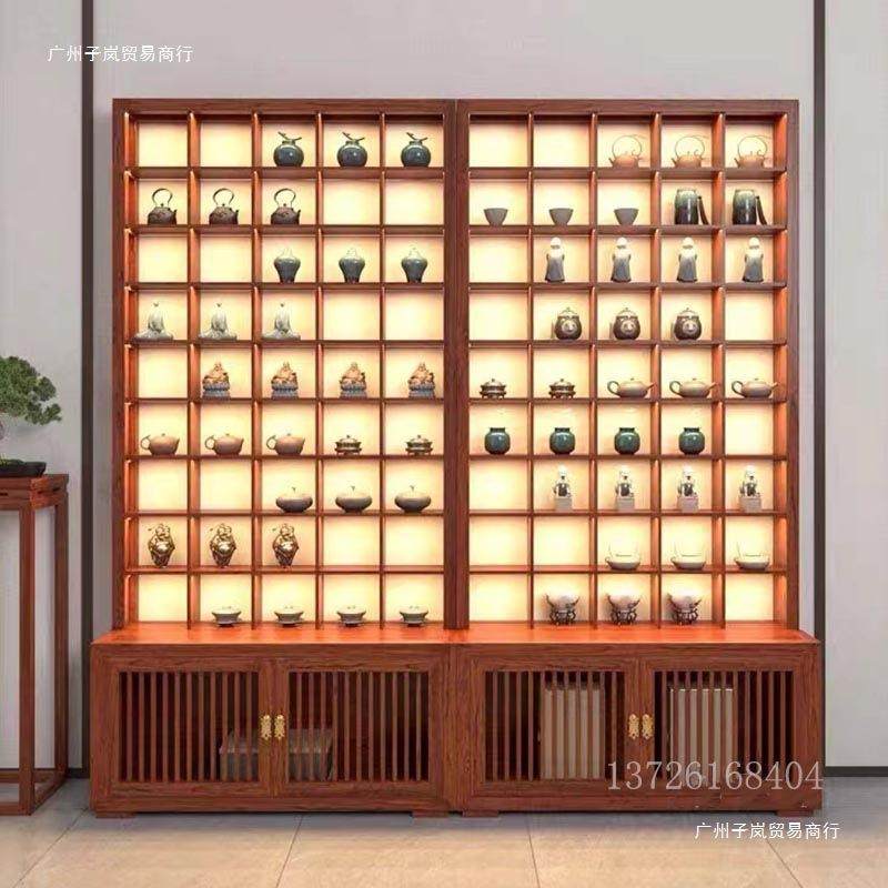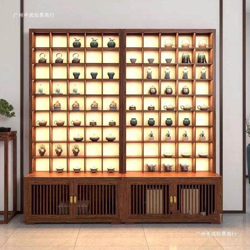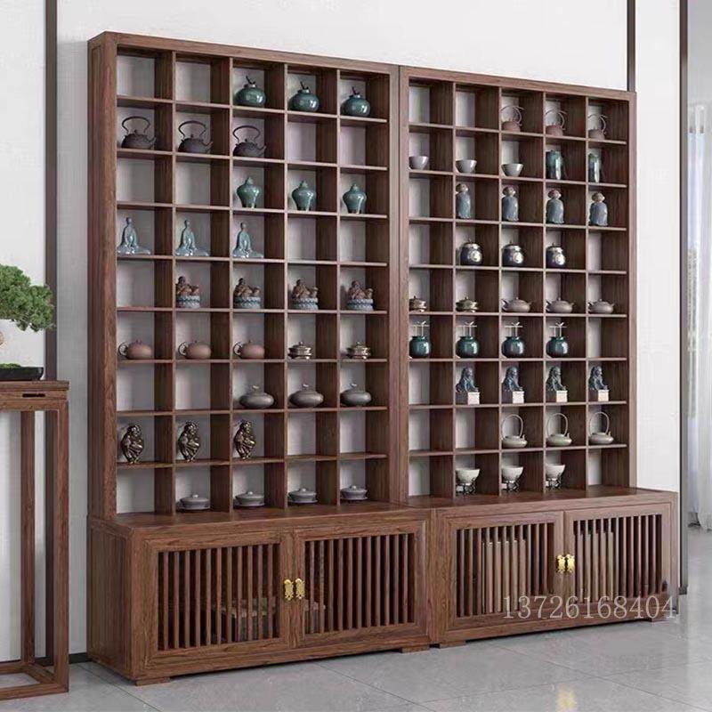 玻璃茶壶展示柜紫砂壶展示架榆木格子架新中式茶杯茶具实木收纳柜