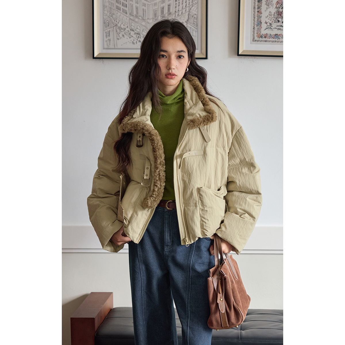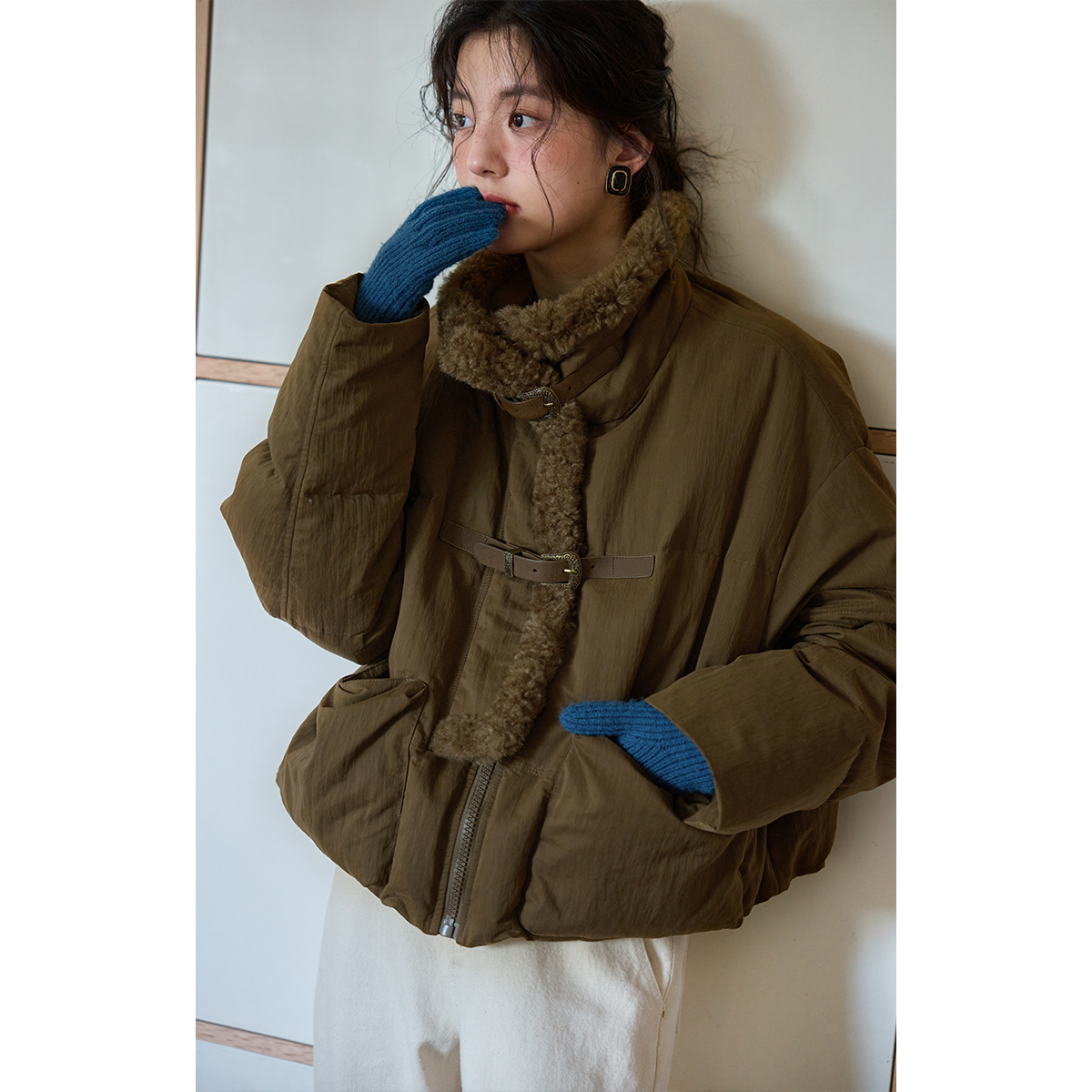 solighter 90白鸭绒立领毛领短款羽绒服女冬季复古小个子厚外套