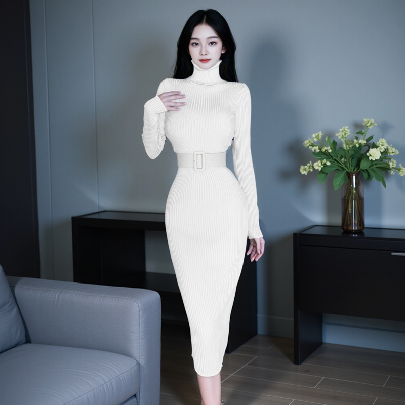 针织连衣裙女秋冬极简百搭高领修身配大衣内搭长款毛衣打底裙过膝