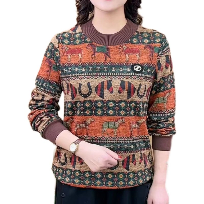 秋冬季新款时尚妈妈装宽松加绒保暖针织打底衫女中老年长袖上衣女