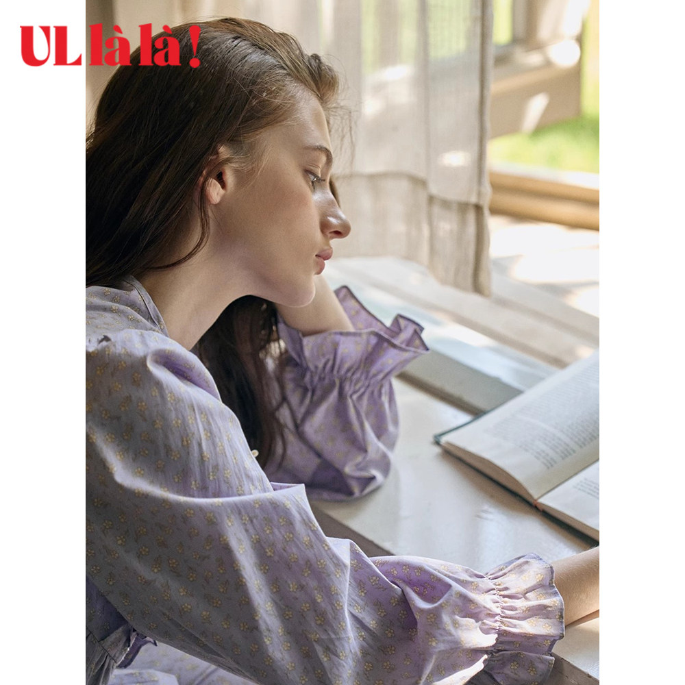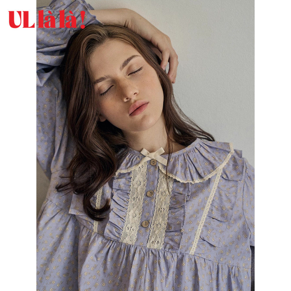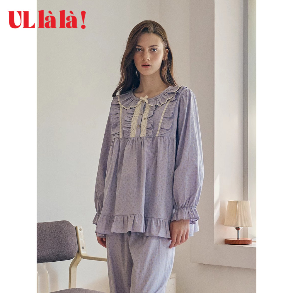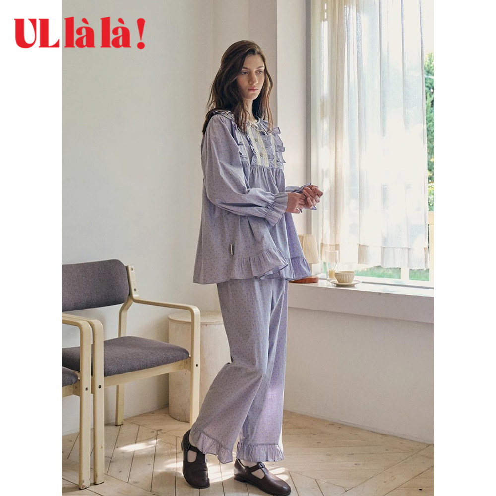 Ullala家居服乌拉拉春夏纯棉套装圆领睡衣睡裤女甜美印花宽松进口