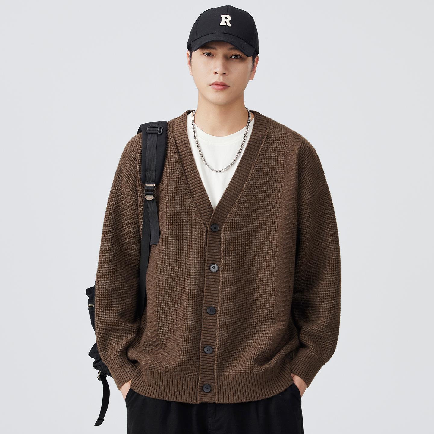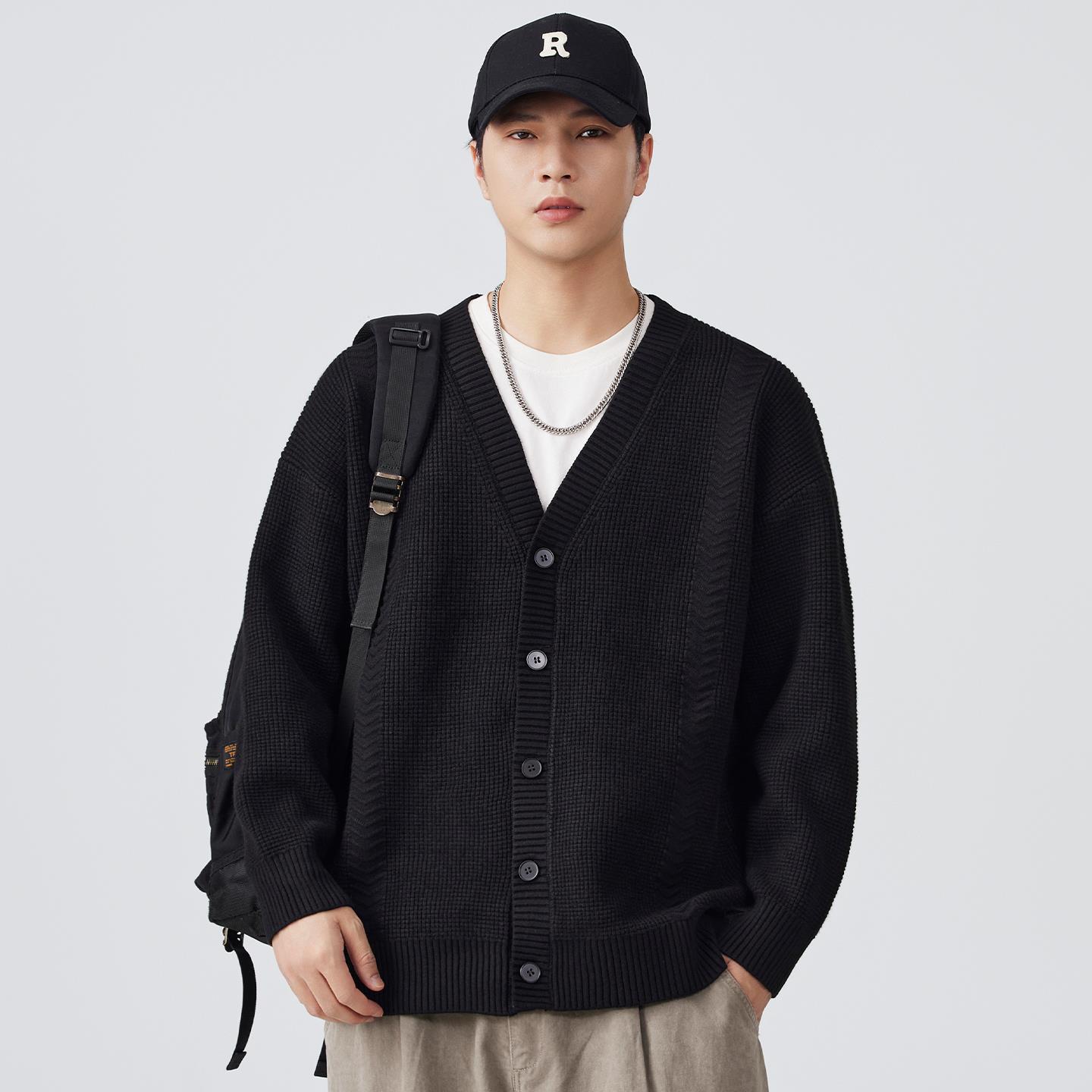 以纯秋冬季针织衫男纽扣开衫v领宽松日系纯色毛衣潮流百搭情侣款