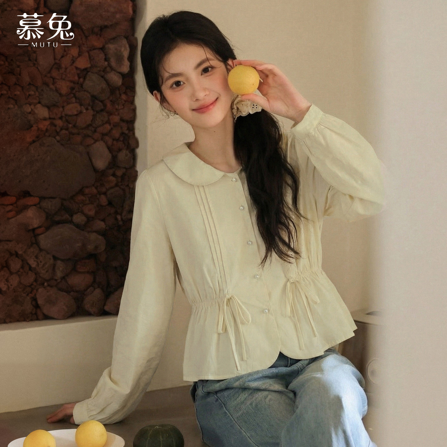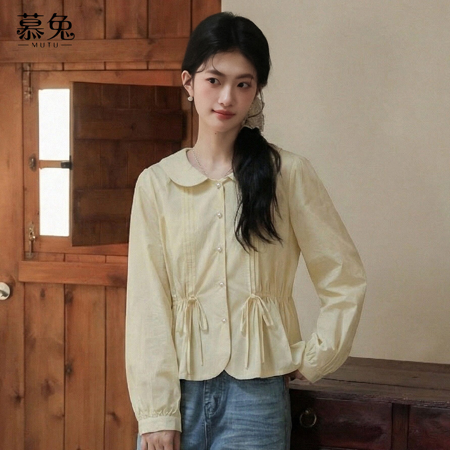 慕兔甜美奶黄色娃娃领衬衫女2026春季新款小个子奶黄色娃娃衫上衣