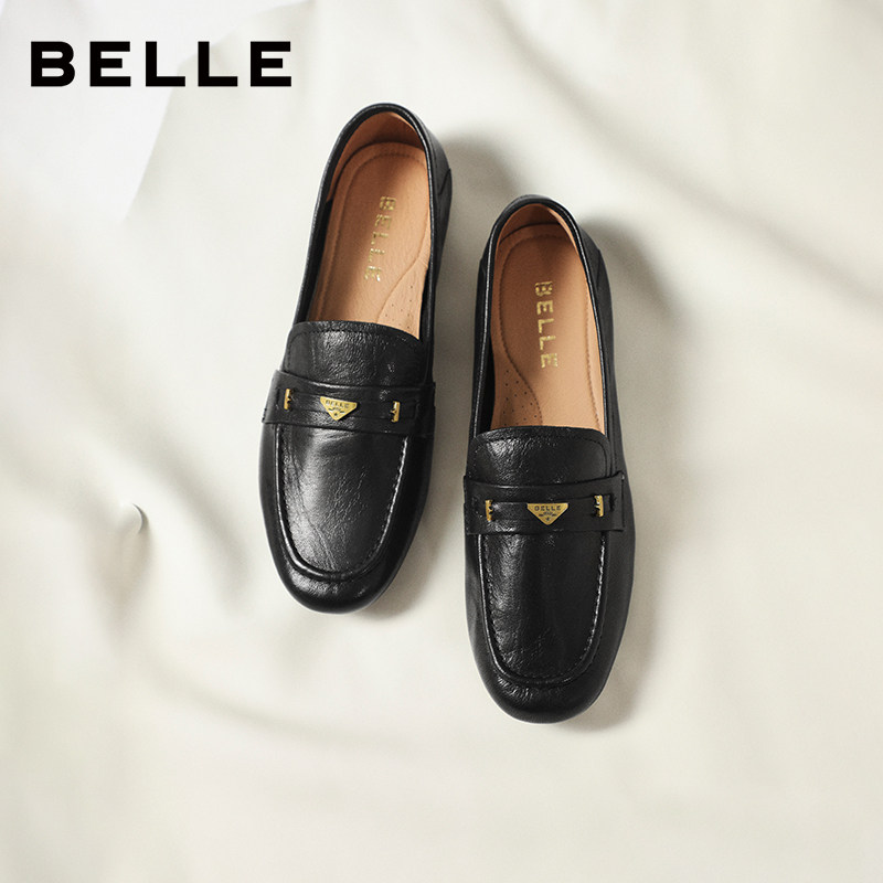 百丽羊皮英伦风乐福小皮鞋女新款软平底豆豆深口单鞋子E3C1DCA5预