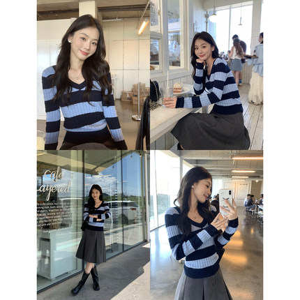 pusumede 小众玩家 v领条纹麻花针织衫女套头长袖修身内搭上衣