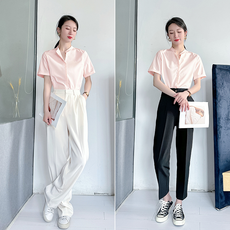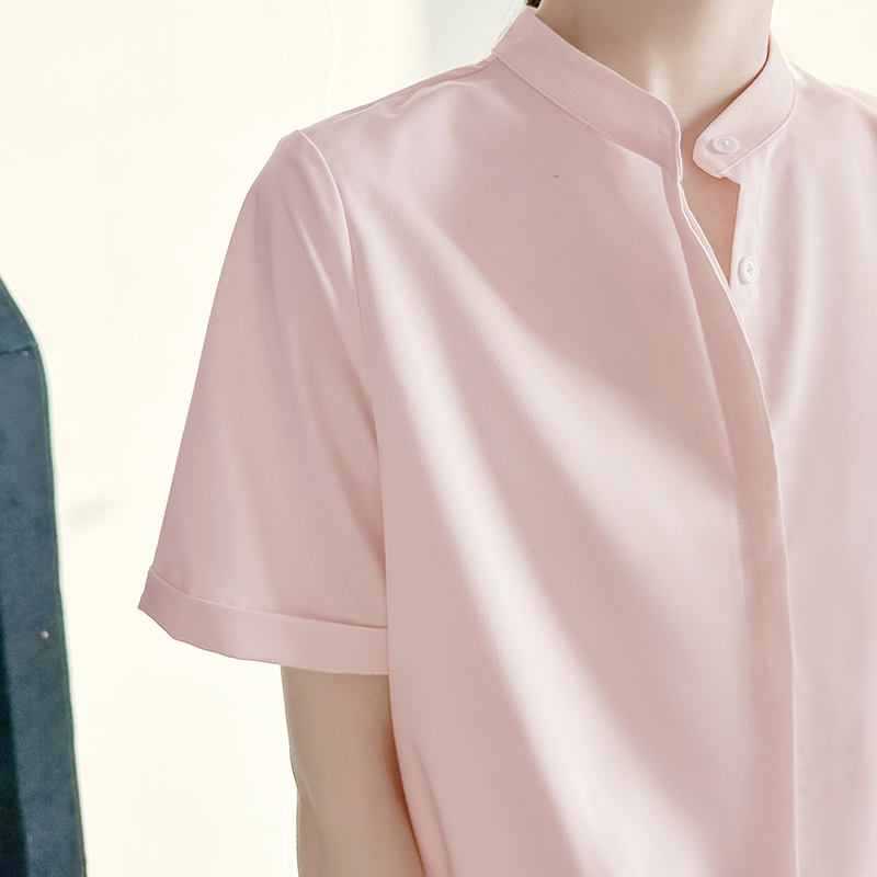 2025夏季新款粉色立领衬衫女高端知性职场轻熟风通勤抗皱别致上衣