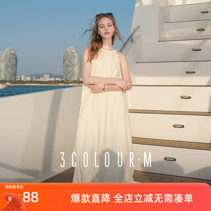 三彩2025夏季新款挂脖连衣裙无袖宽松A字裙氛围感长裙度假M