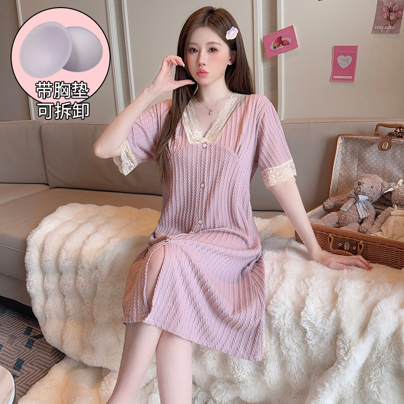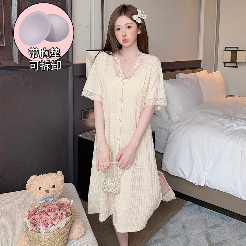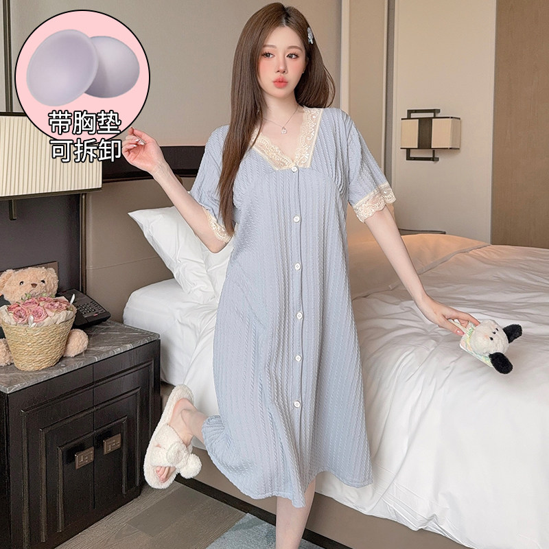 大码睡裙女夏季纯棉加肥加大胖MM200斤孕妇开衫裙蕾丝小香风睡衣