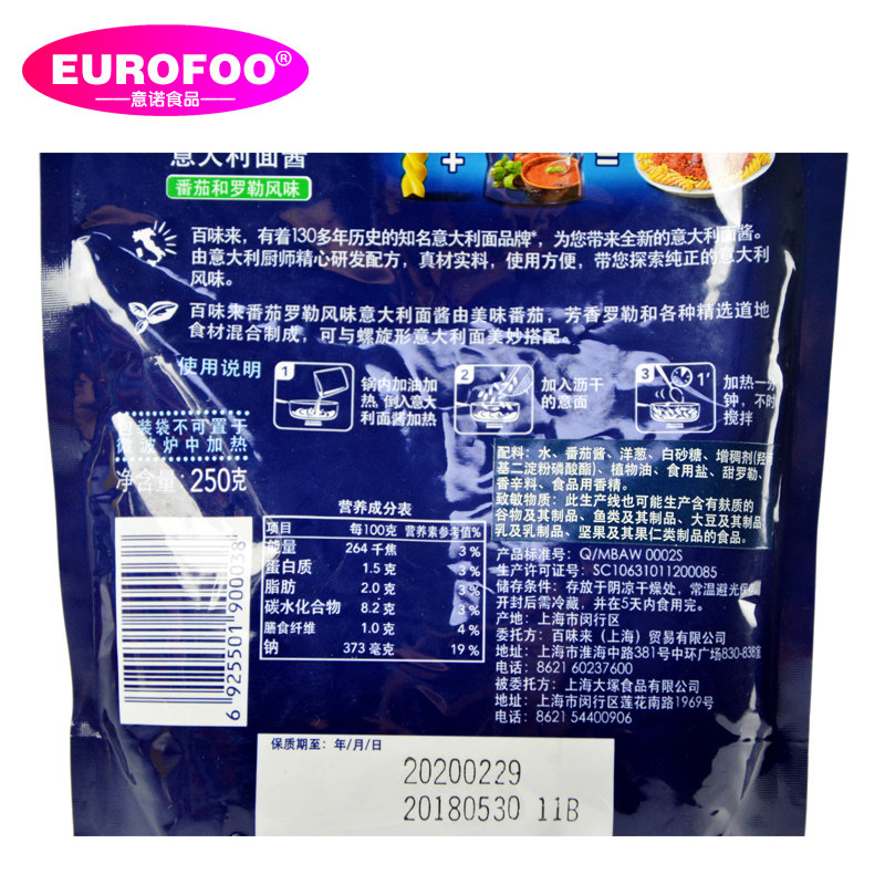 意大利面酱 百味来番茄和罗勒风味意面酱意粉酱调味酱250g