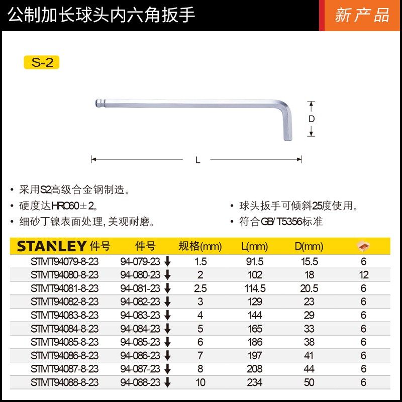 史丹利工具公制加长球头平头内六角扳手1.5-10mm