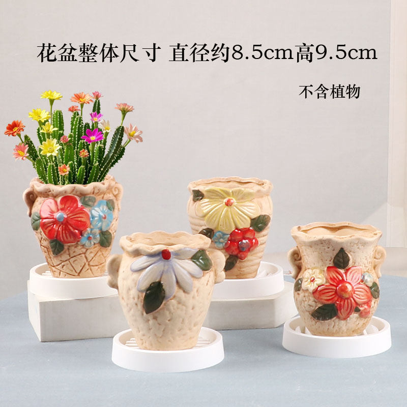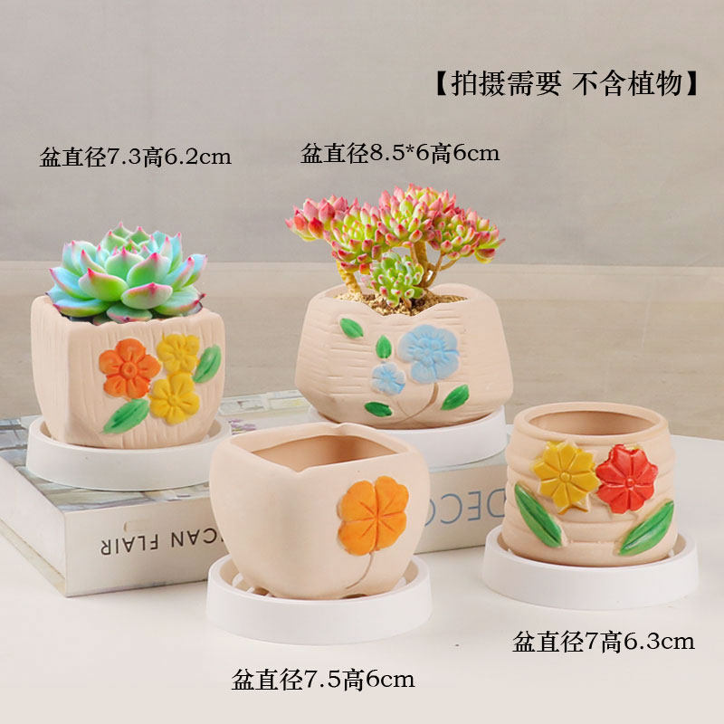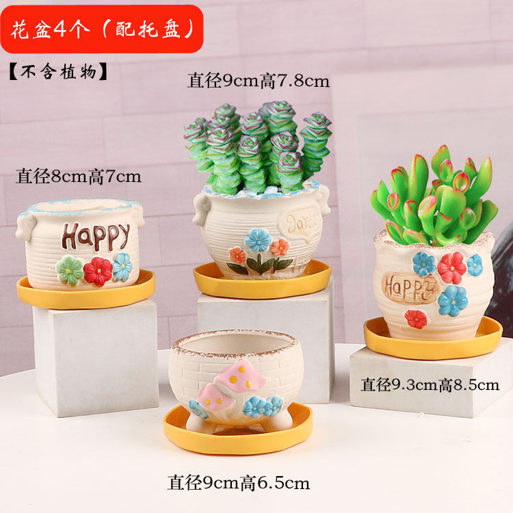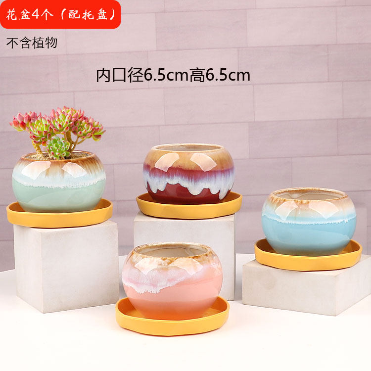 多肉花盆陶瓷圆形简约创意个性透气室内家用小绿植盆栽摆件带托盘