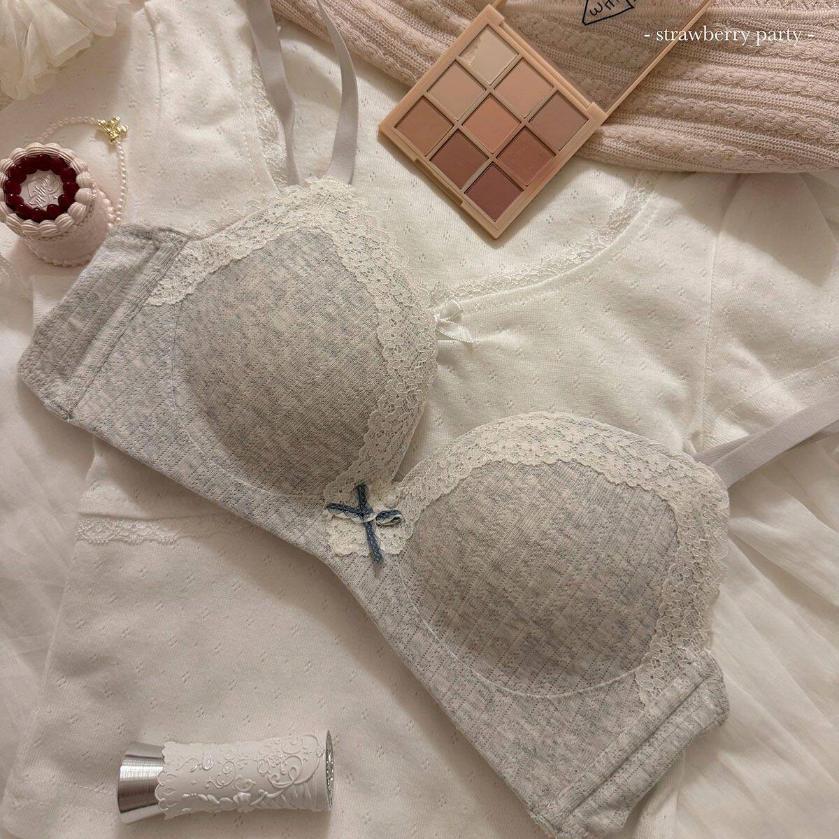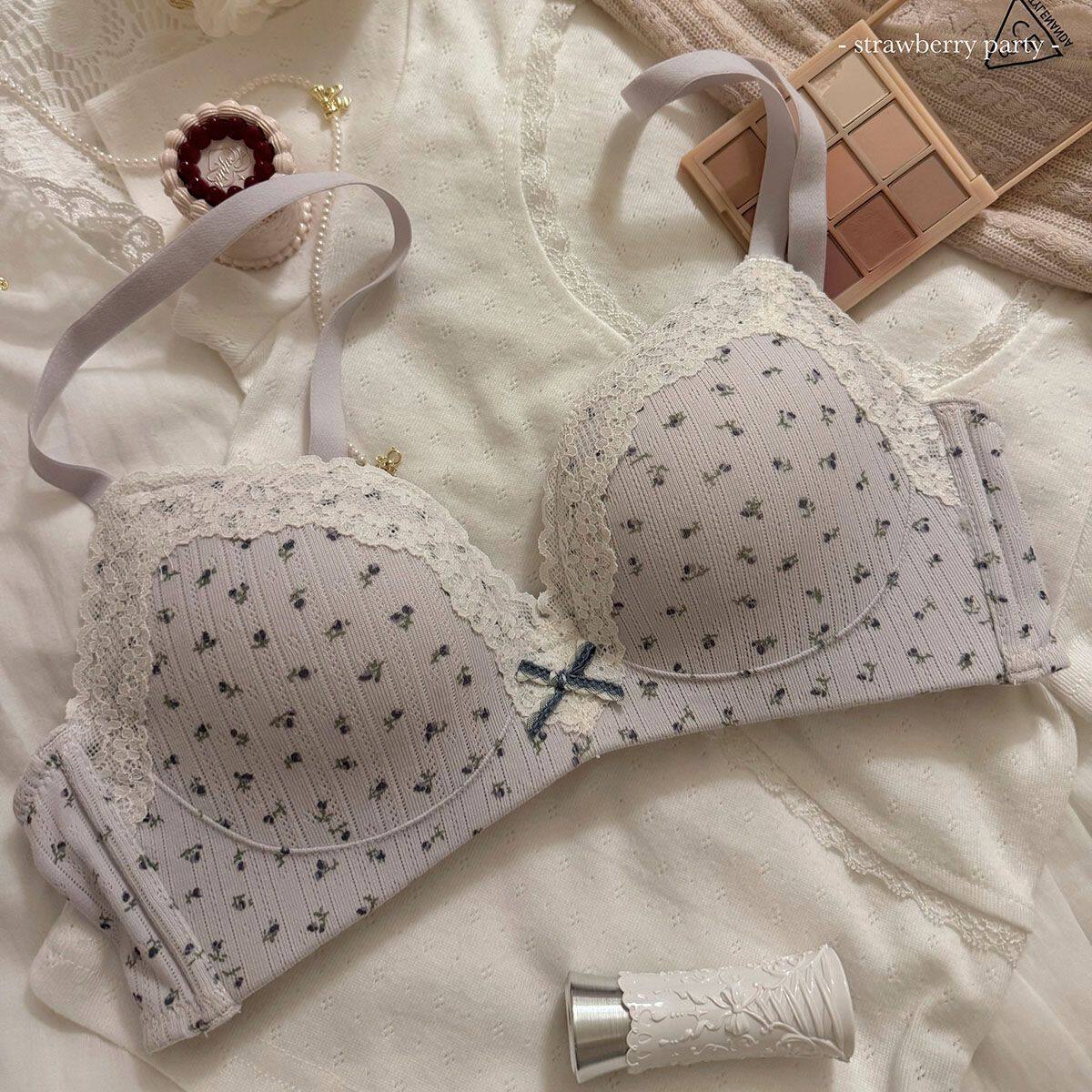 草莓麻薯~温柔纯欲少女蕾丝边碎花内衣女小胸聚拢无钢圈文胸套装