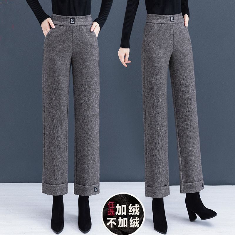 羊毛呢九分裤女秋冬加绒加厚高腰休闲宽松弹力保暖抗寒直筒妈妈裤