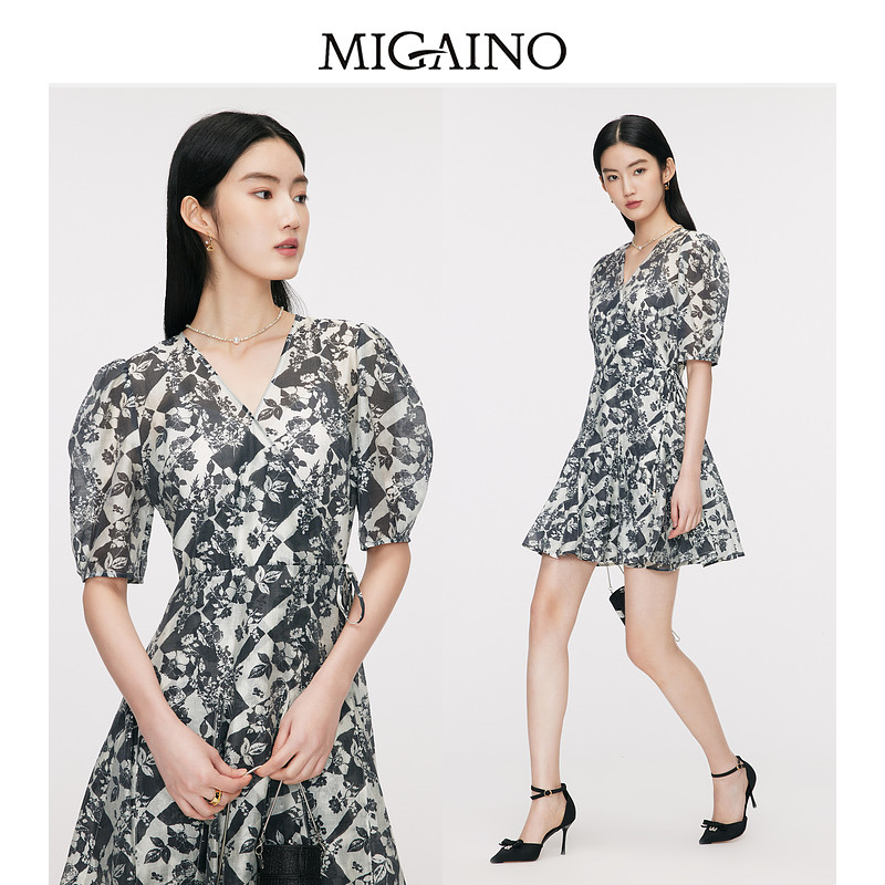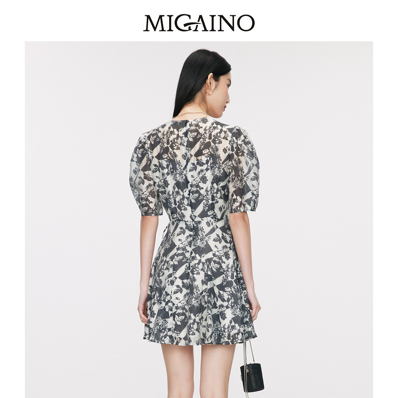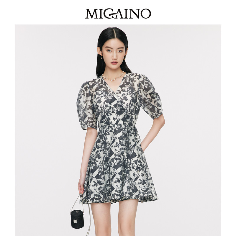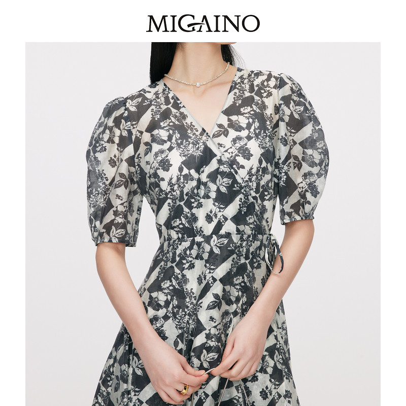 Migaino曼娅奴艺术印花连衣裙夏季新款V领收腰显瘦A字裙