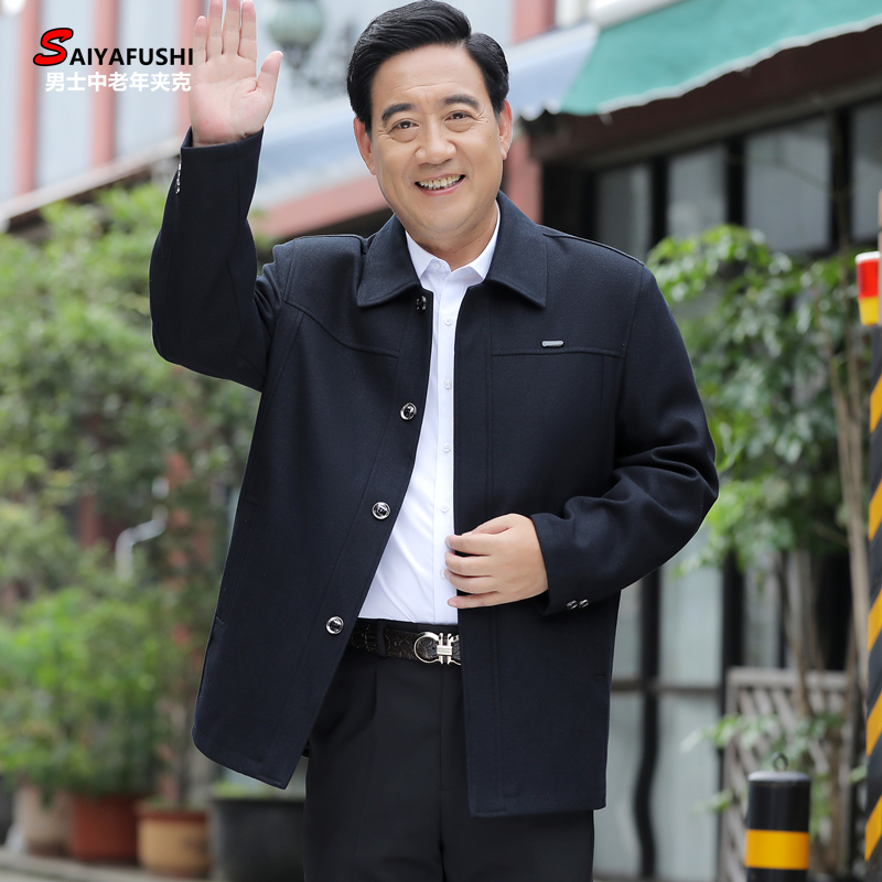 男中老年人扣子夹克衫春秋冬装厚爸爸外套加绒爷爷翻领宽松70岁80