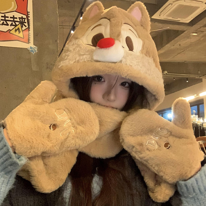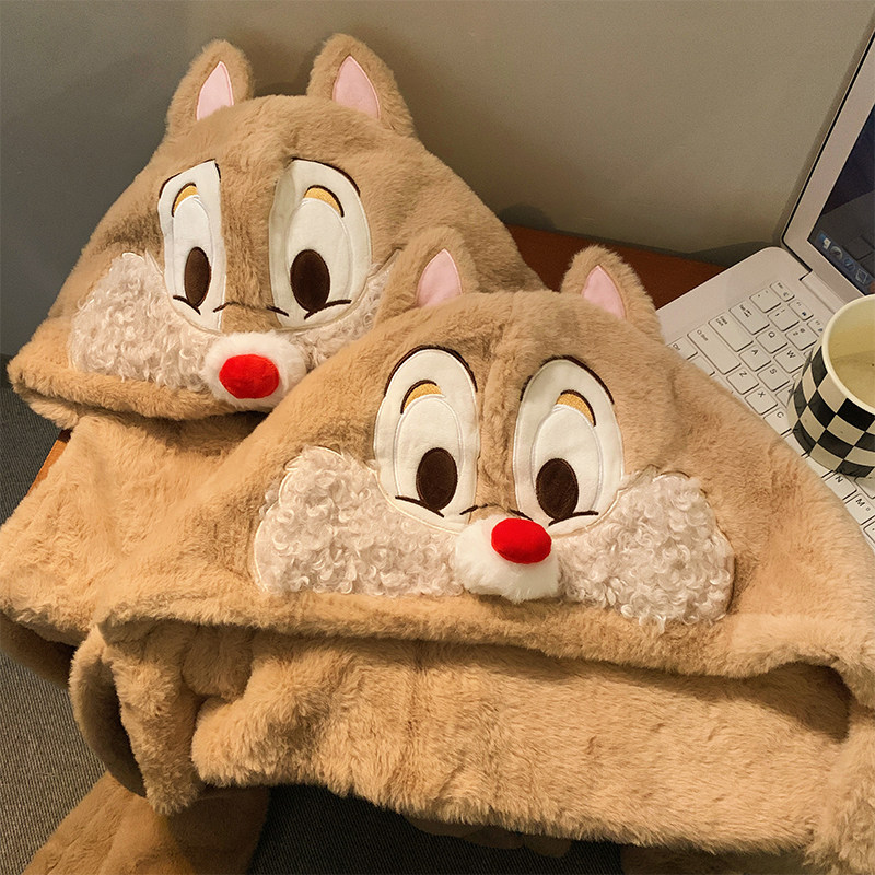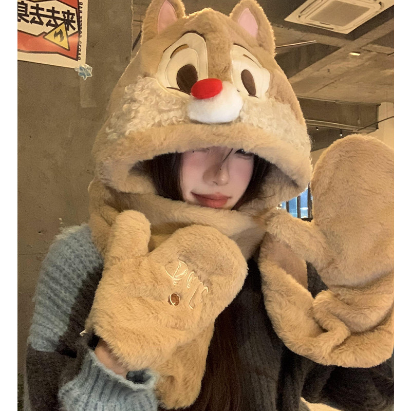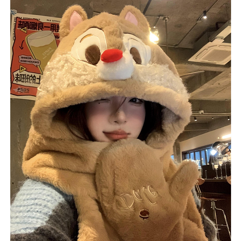 正版迪士尼奇奇蒂蒂毛绒帽子围巾一体女2025年秋冬保暖护耳套头帽