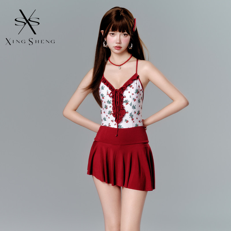 2025年新款爆款法式少女沙滩度假草莓印花连体遮肉比基尼泳衣套装