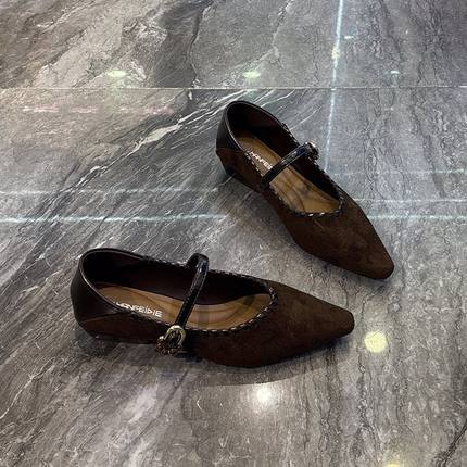 网红绒面粗跟浅口单鞋女2026春季新款低跟一字带气质尖头玛丽珍鞋