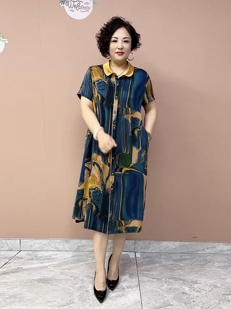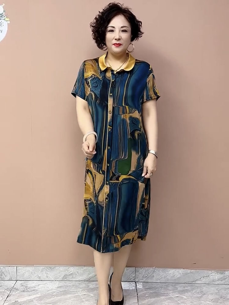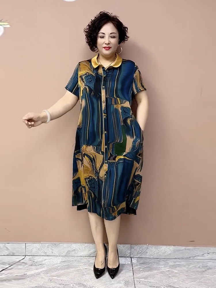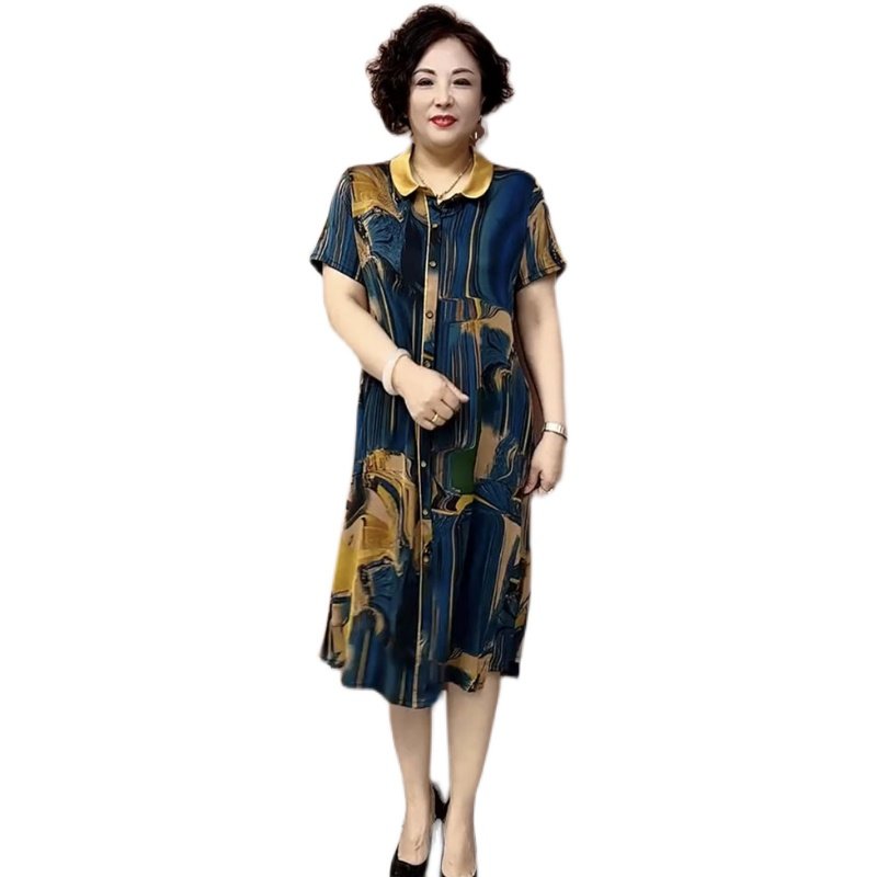 夏季新款真丝连衣裙时尚网红妈妈娃娃领加肥加大遮肉显瘦衬衫裙子