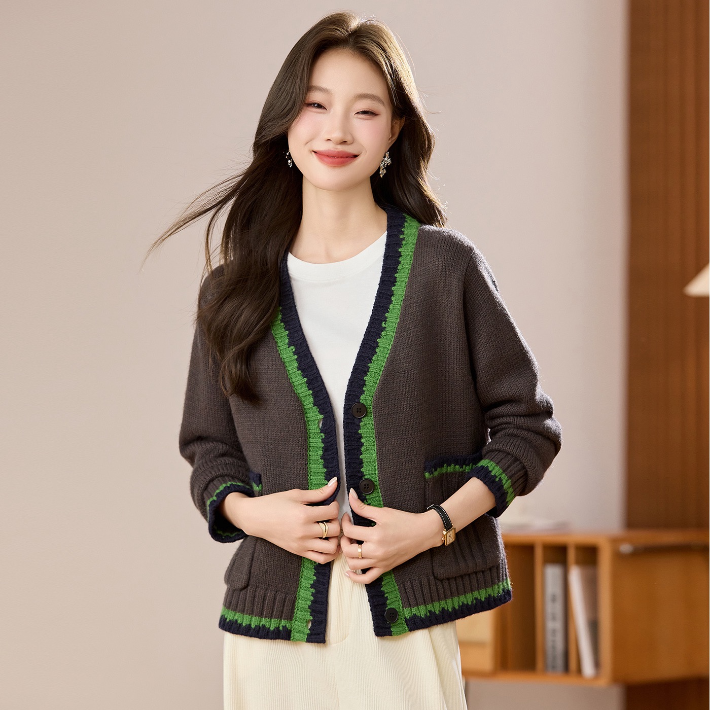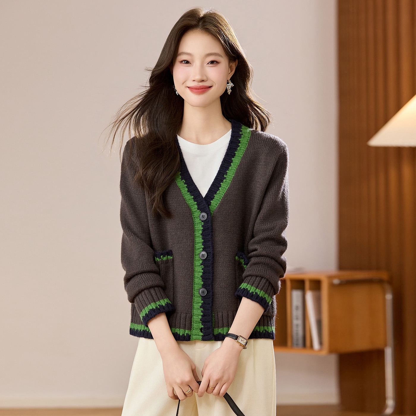 学院风秋装新款休闲宽松短款针织上衣复古撞色领子开衫毛衣外套女