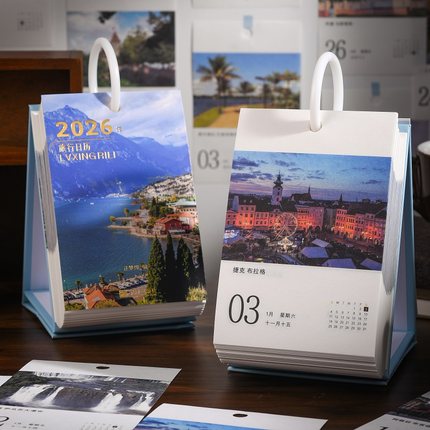 2026年旅行日历新款定制创意风景台历文艺清新ins桌面摆件翻页旅游摄影打卡风景记事单向新年礼物团购台历