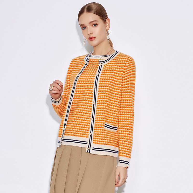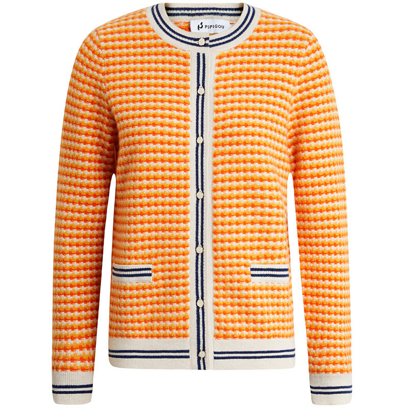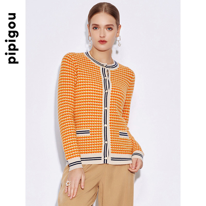皮皮狗商场同款圆领撞色格纹提花羊绒衫针织开衫外套
