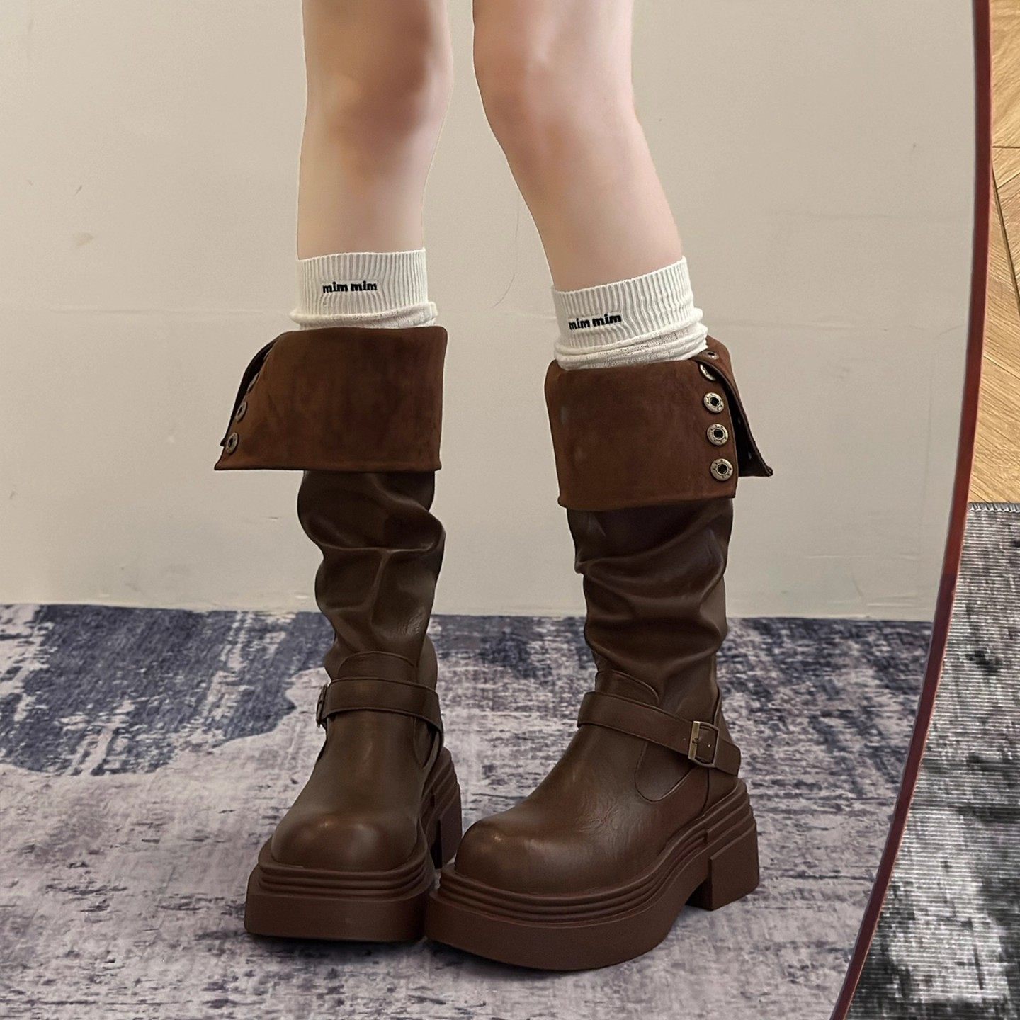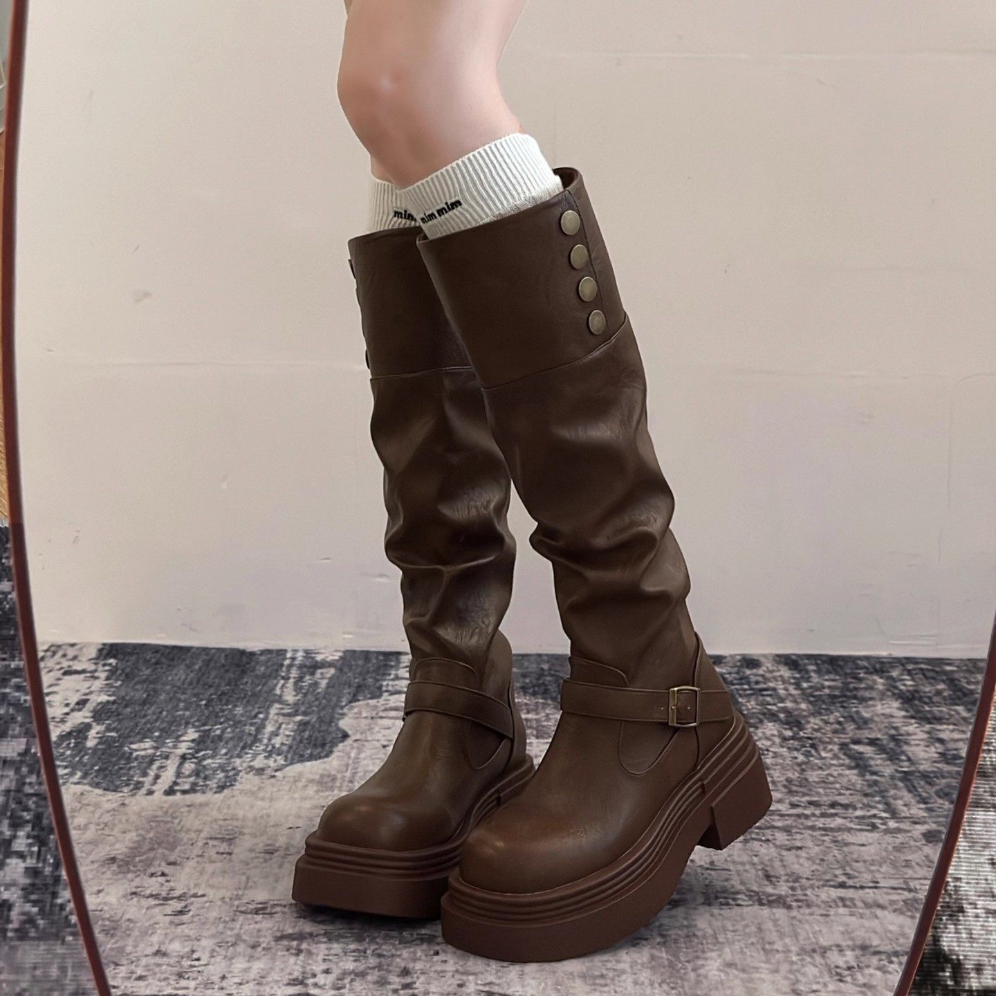 棕色复古英伦风粗跟厚底长筒靴女2025新款秋冬季显瘦长靴骑士靴子
