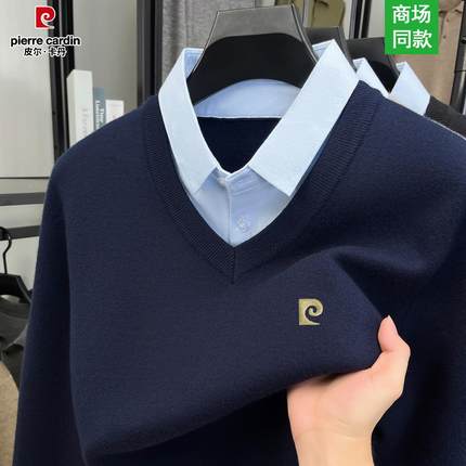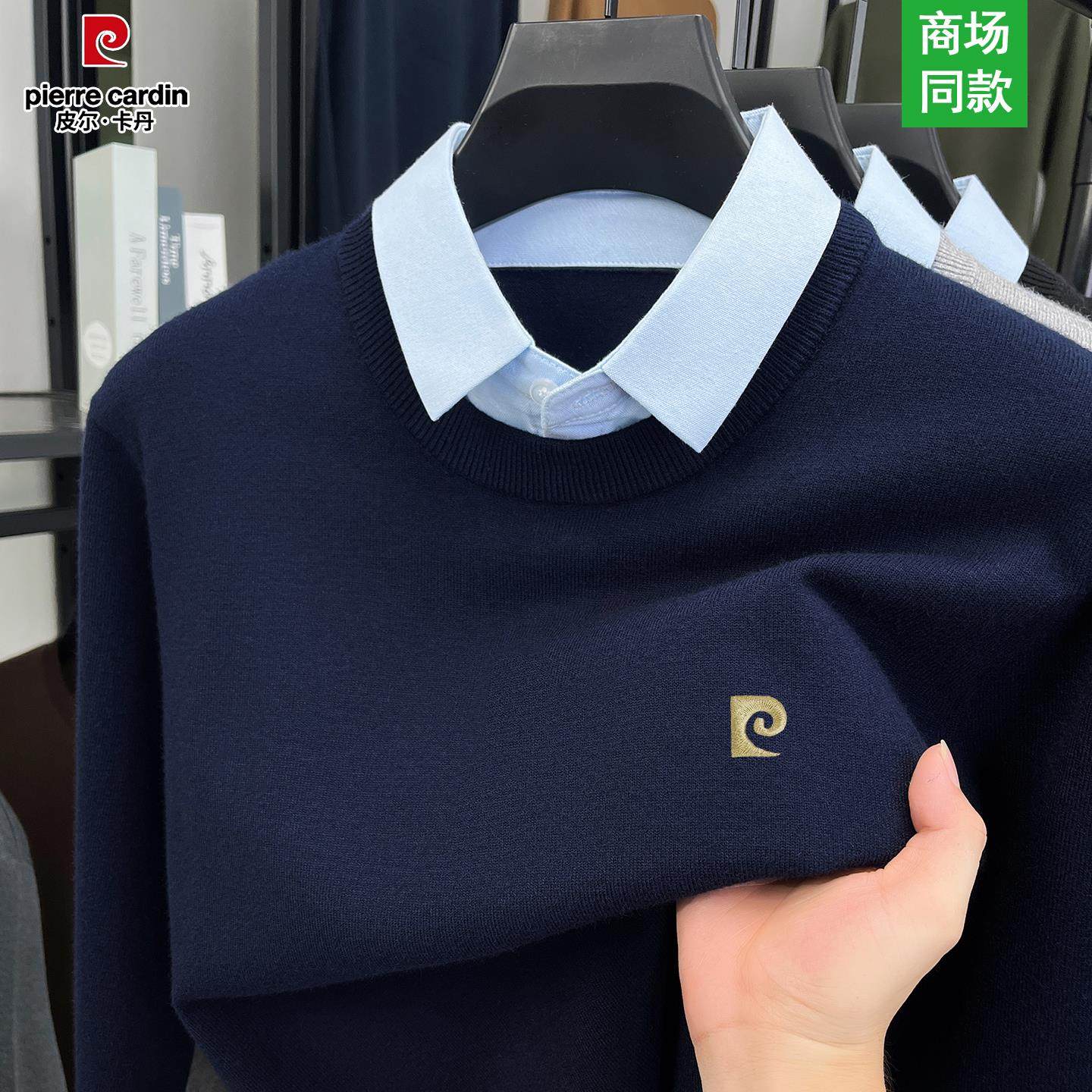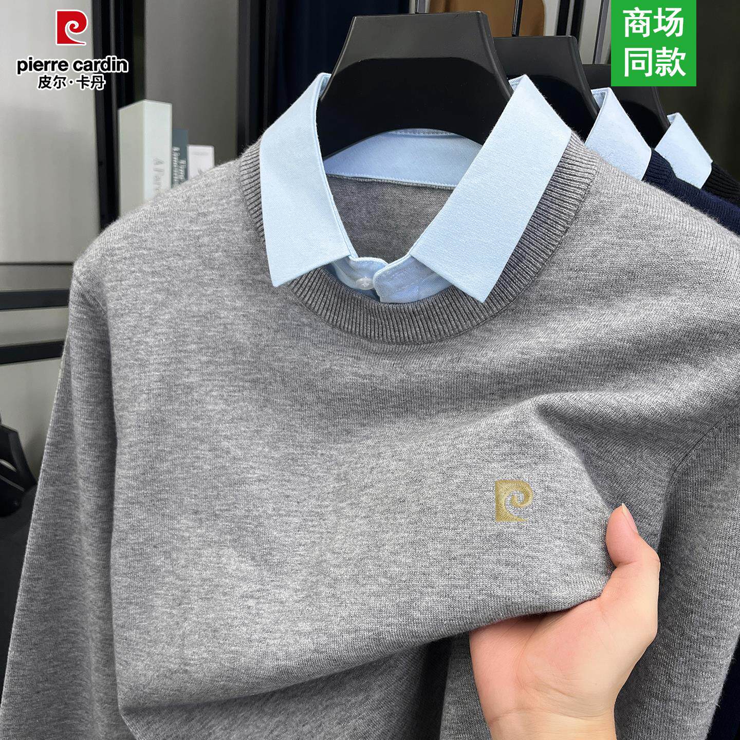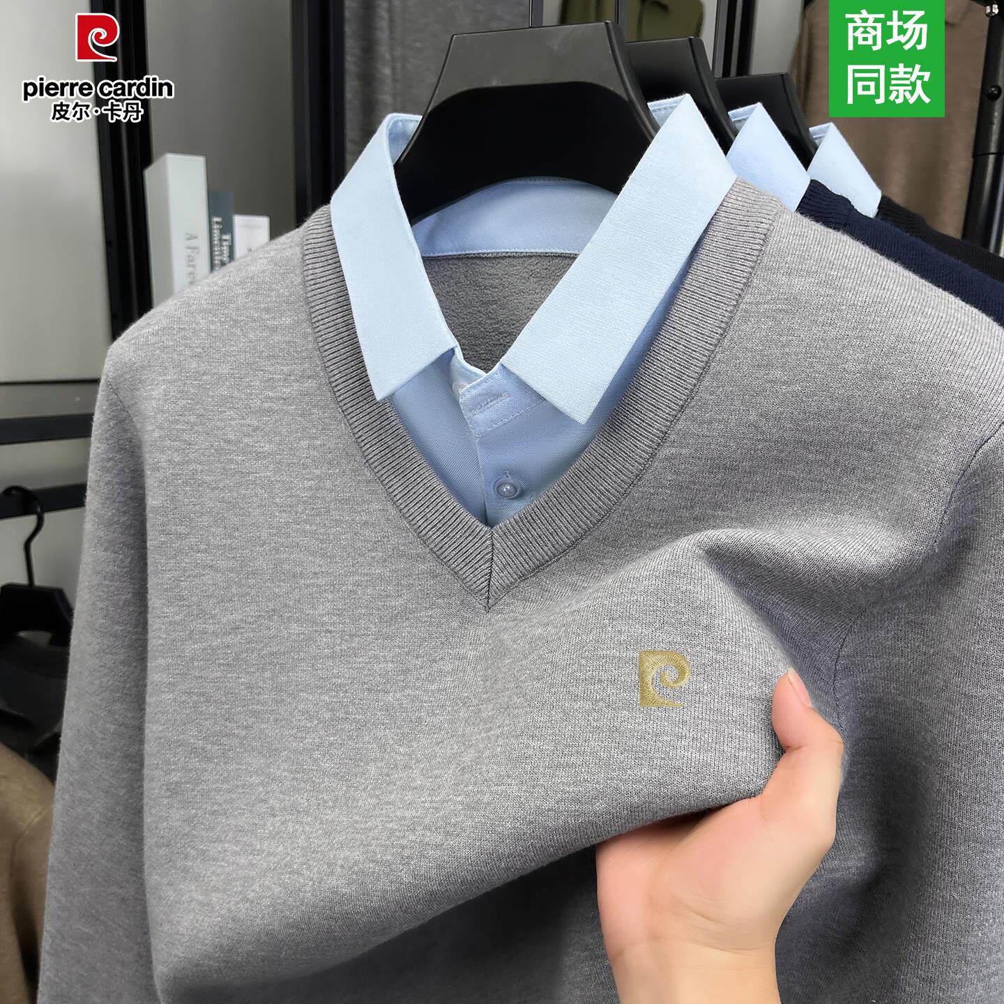 皮尔卡丹假两件衬衫领针织衫男秋冬新款加绒加厚长袖保暖打底毛衣