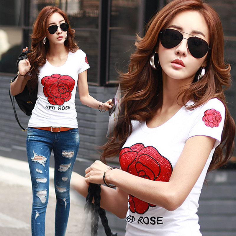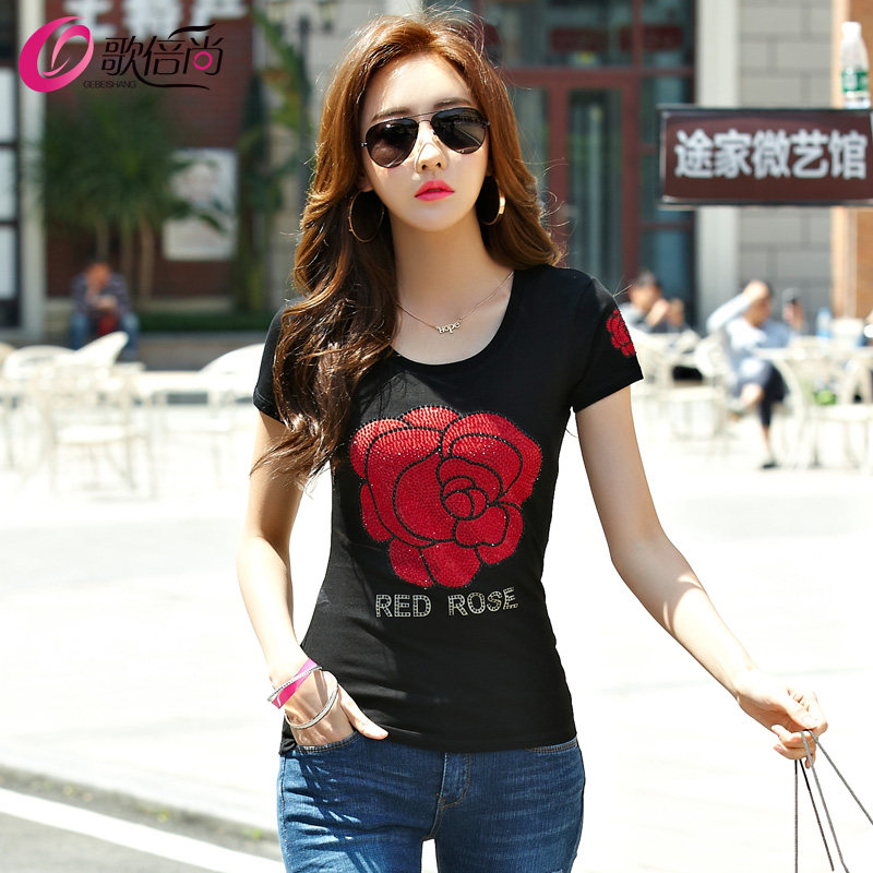 2025欧货新款夏装欧洲站重工玫瑰花短袖t恤修身女装半袖体恤上衣