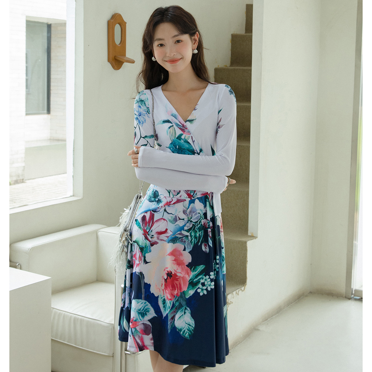 高支高弹力水晶麻|温柔复古系带V领衬衫裙|立裁收腰长袖连衣裙