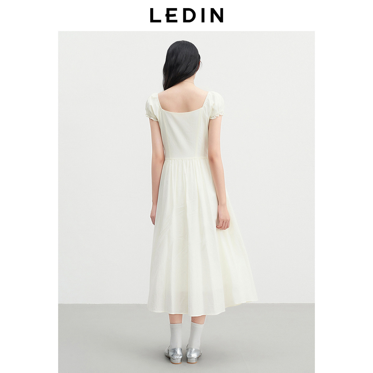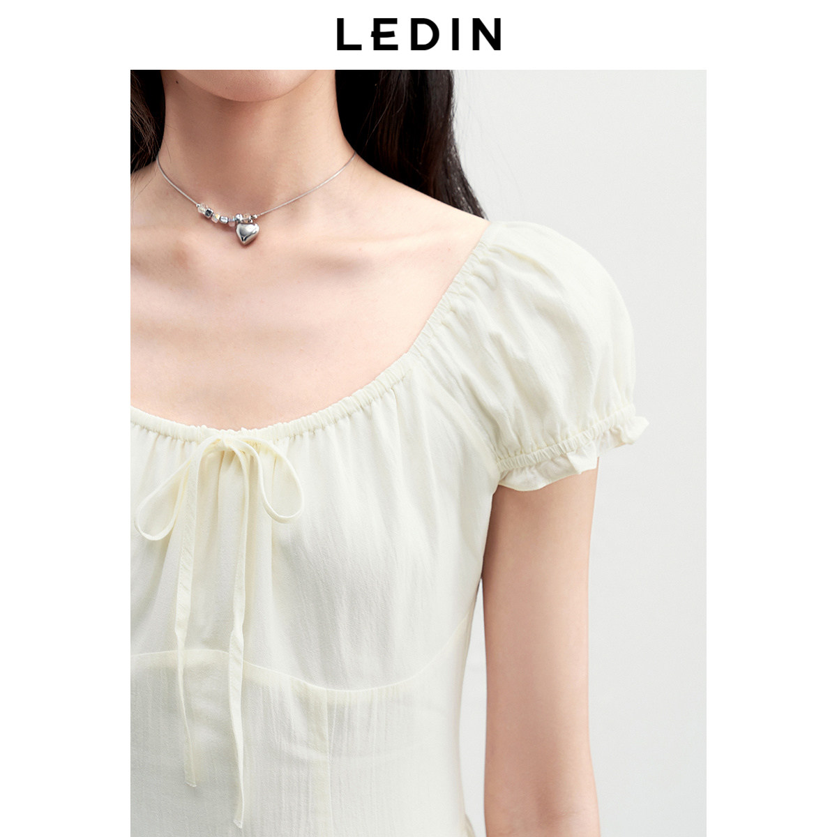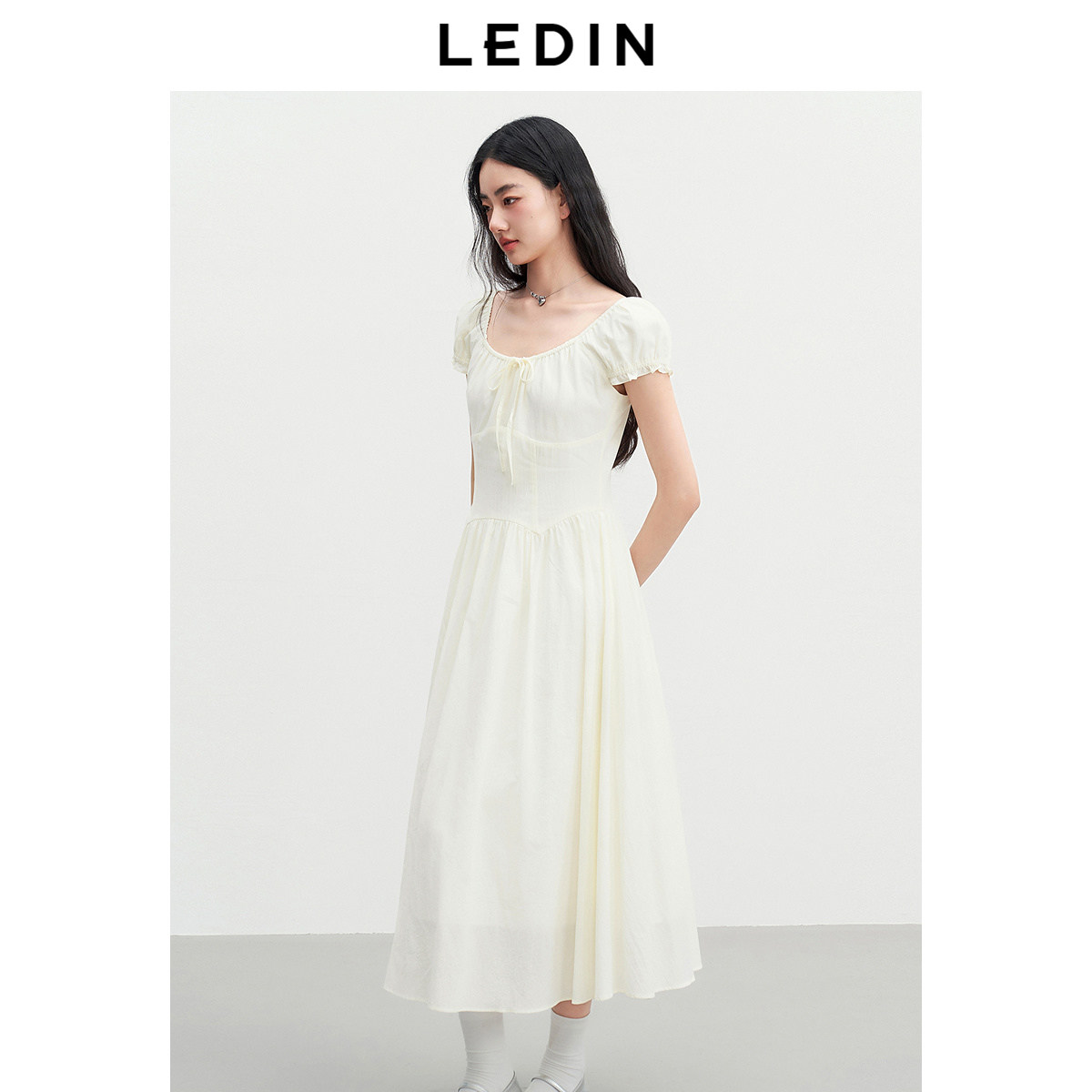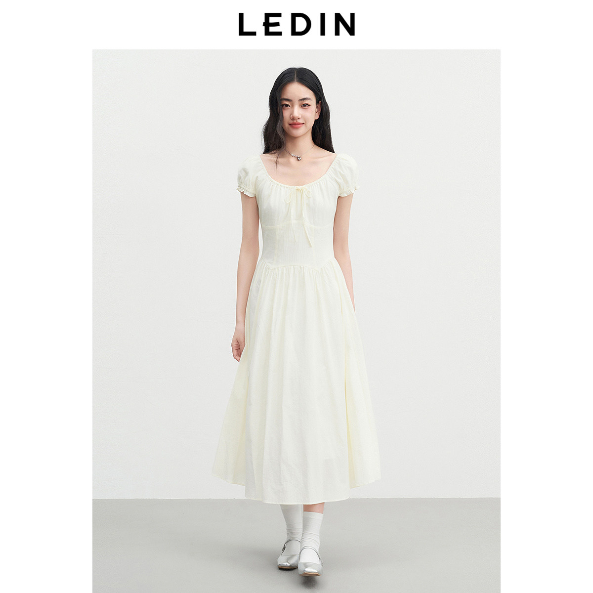 乐町小泡泡袖仙女裙夏新款可调节抽皱系带方领长裙显高显瘦短袖裙