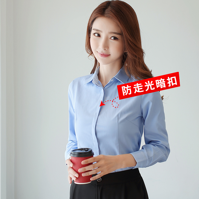 新款方领长袖工装防走光职业装白色衬衣女工作服修身显瘦正装衬衫